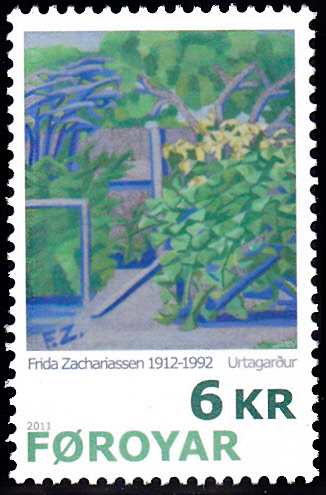 Hier eine Marke aus Dänemark Färöer (MiNr 728) mit dem Gemälde "Garten" von Frida Zachariassen.