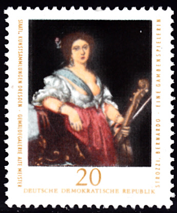 Das Gemälde "Eine Gambenspielerin" von Bernardo Strozzi ist auf dieser Marke der DDR (MiNr 2195) zu sehen.