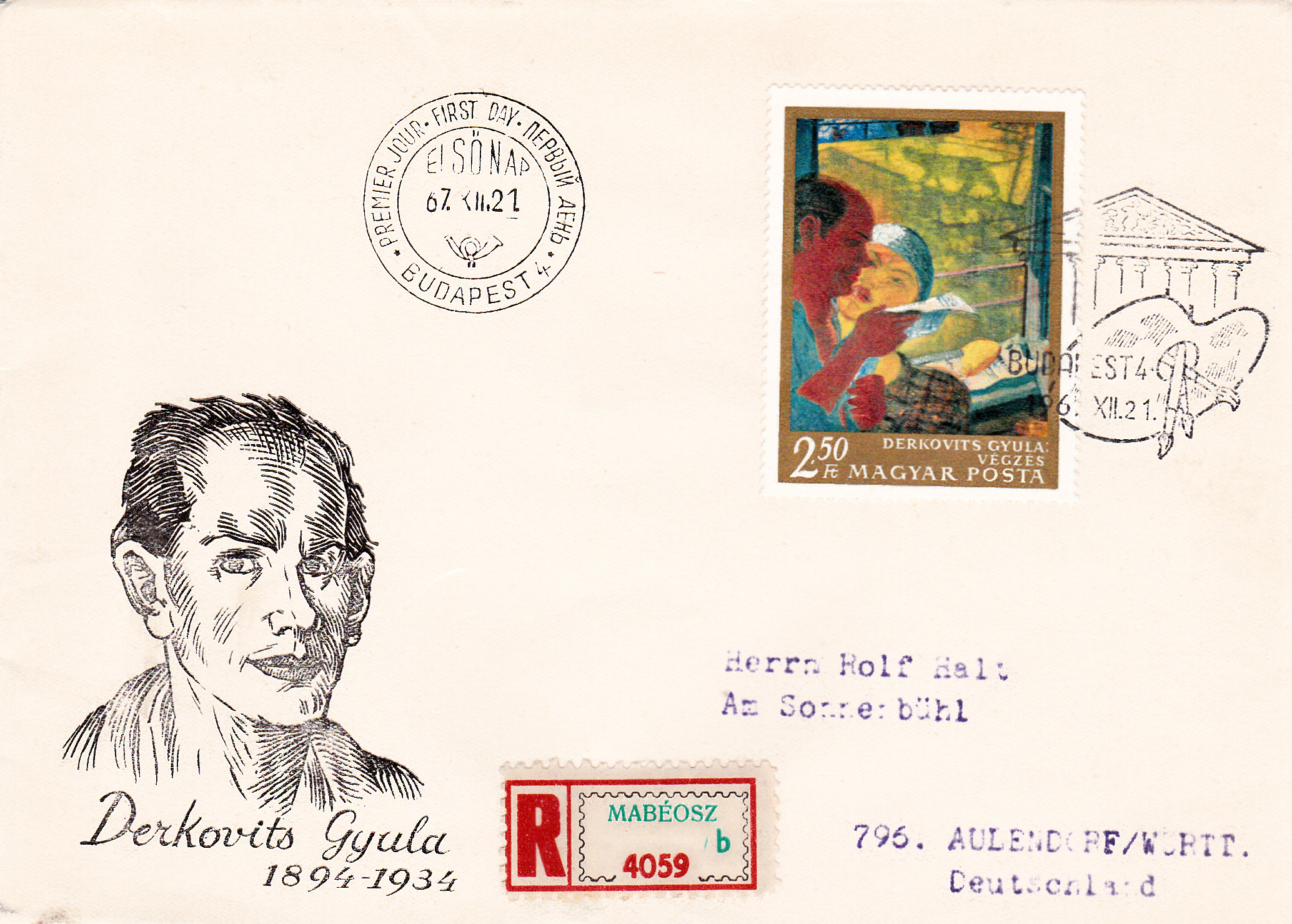In einer Serie "Gemälde der Nationalgalerie Budapest Meister des 20. Jahrhunderts" ist in Ungarn 1967 auch eine Marke (MiNr 2375 A) mit dem Gemälde "Zwangsräumungsbeschluss" von Gyula Derkovits erschienen. Hier wurde eine Marke auf einem Brief mit Einschreiben nach Deutschland zur Frankatur verwendet.