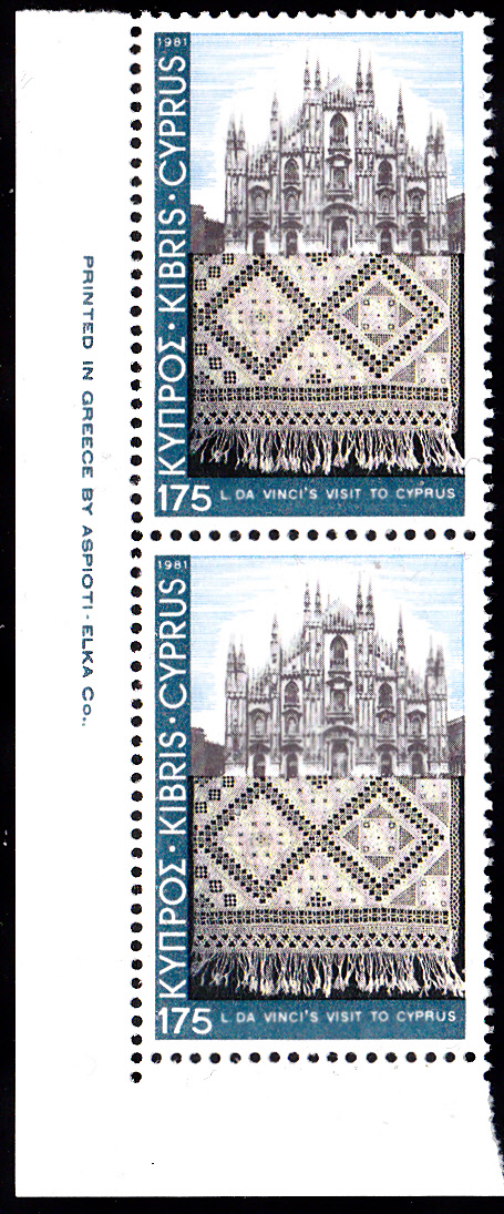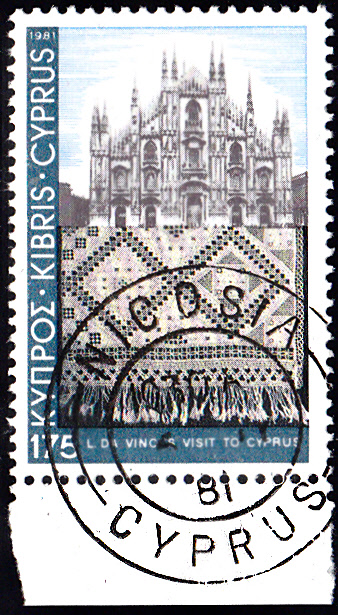 Auf der dritten Marke zum 500. Jahrestag des Besuchs von Leonardo da Vinci in Zypern werden der Mailänder Dom und ein Wandbehang aus Spitzen abgebildet.