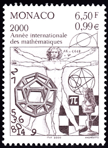 Diese Marke aus Monaco (MiNr 2518) zum Internationalen Jahr der Mathematik zeigt unter anderem die Zeichnung "Der vitruvianische Mensch" von Leonardo da Vinci.
