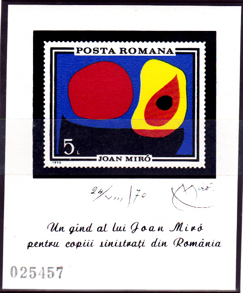 Auch ein Block aus Rumänien (MiNr. Block 81) zeigt ein Bild von Miro, dessen Titel ich bisher auch nicht finden konnte. Der Block ist übrigens nicht rechtwinklig geschnitten, wie der Scan eindeutig zeigt. Ob dies bei allen Blocks der Fall ist, ist mir nicht bekannt.