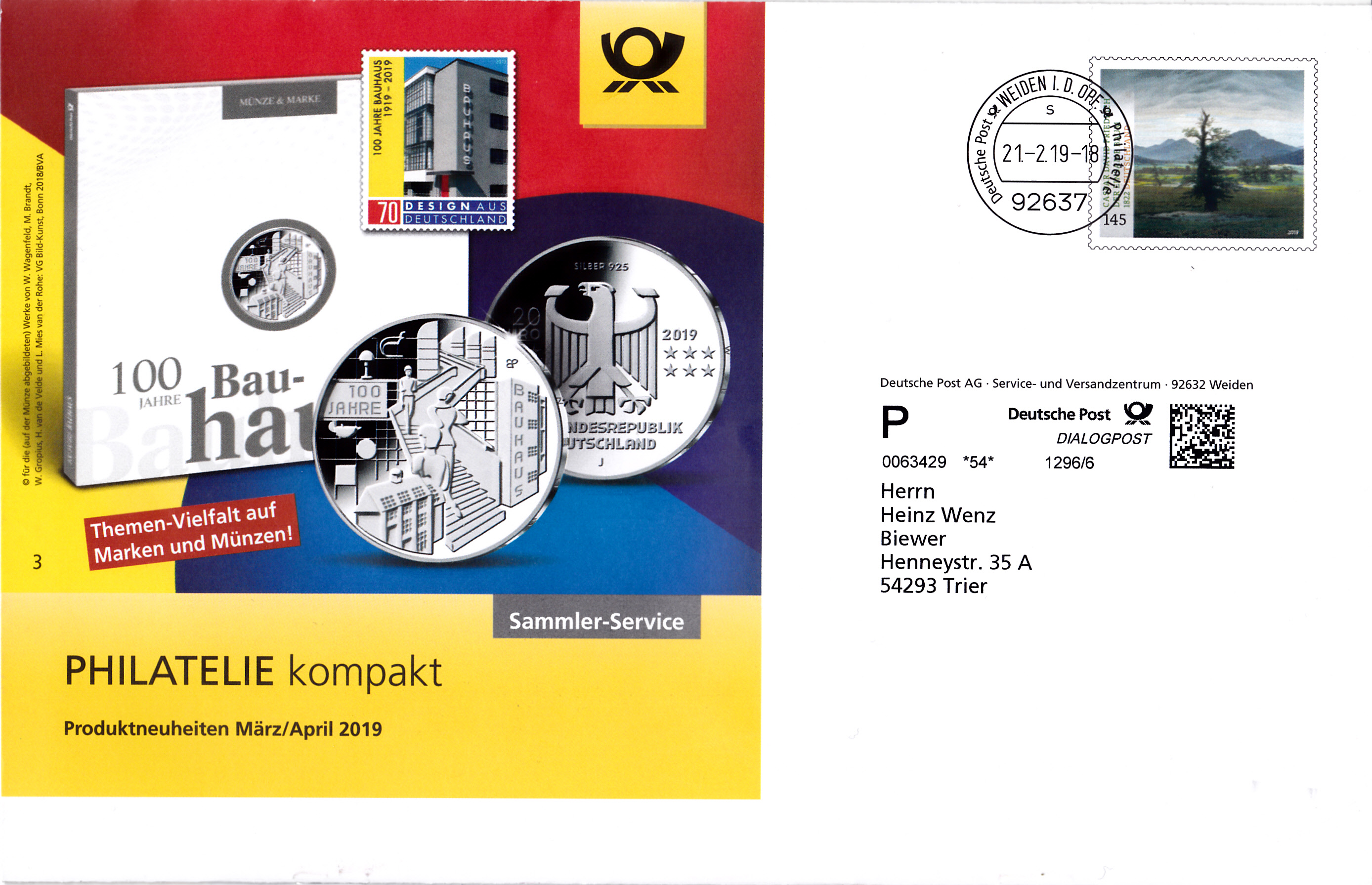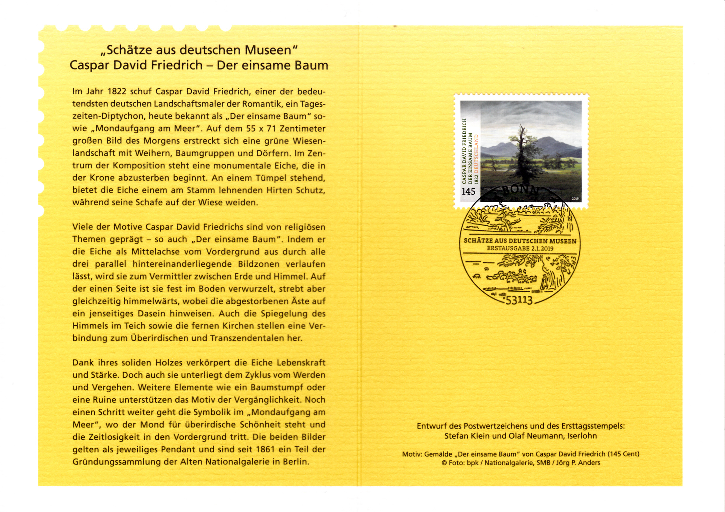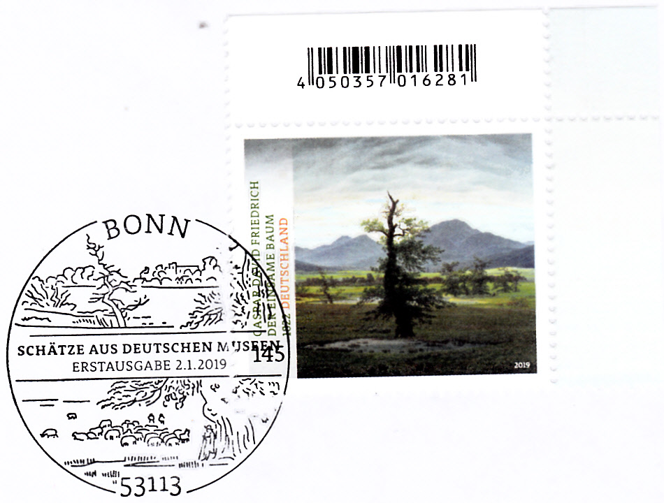 Diese Broschüre im Format 235 x 152 mm (unten geheftet) hat einen Wertstempel mit der 145 Cent Marke "Der einsame Baum" nach dem Gemälde von Caspar David Friedrich (MiNr 3433) aus der Serie "Schätze aus deutschen Museen". Die Vorausentwertung hat das Datum "21.-2.19".