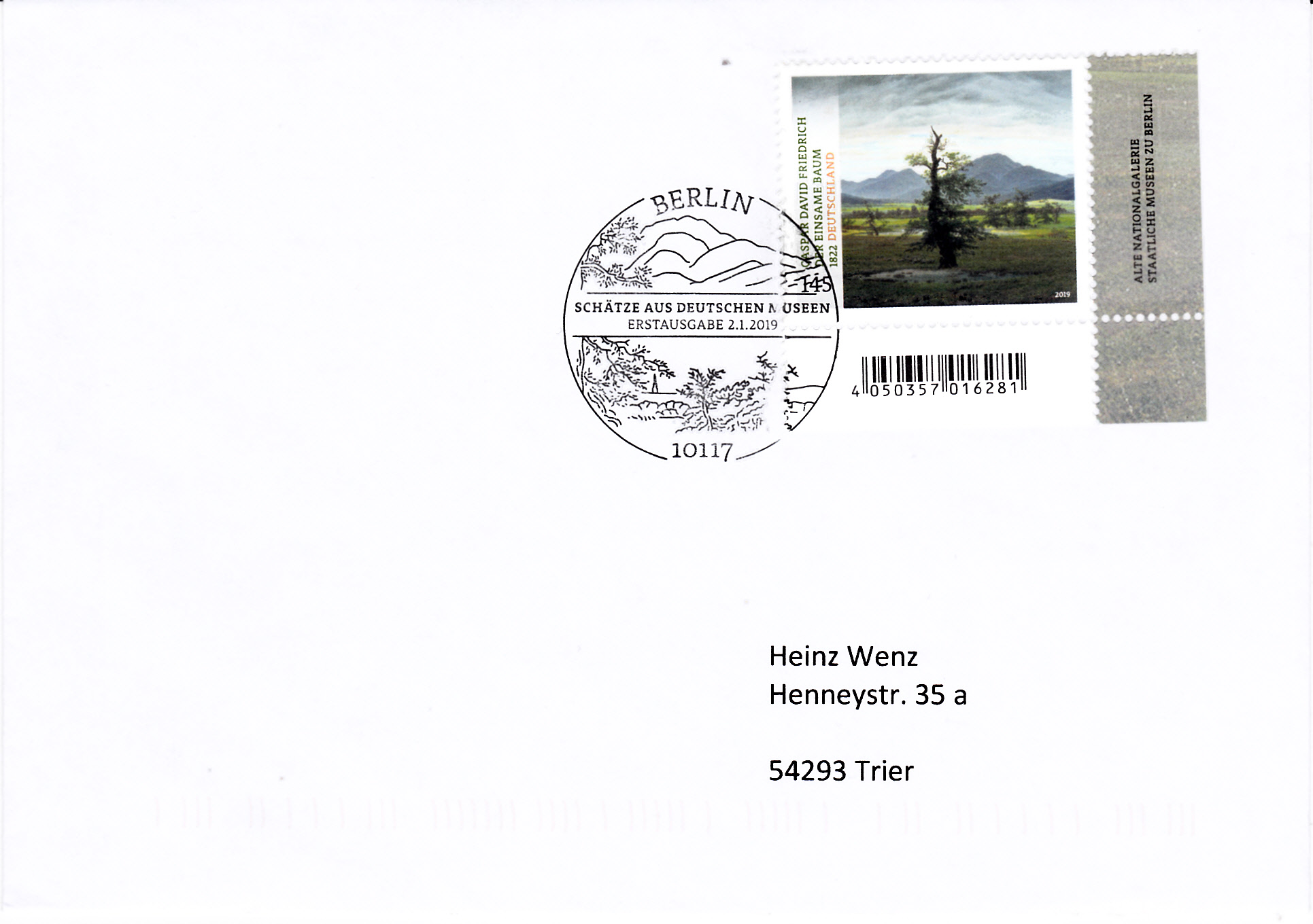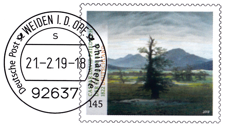 Umschlag im Format 229x162 mm mit einem Wertstempel mit der 145 Cent Marke "Der einsame Baum" nach dem Gemälde von Caspar David Friedrich (MiNr 3433) aus der Serie "Schätze aus deutschen Museen" mit aufgedruckter Zähnung und Vorausentwertung "Deutsche Post (Posthorn) WEIDEN I.D.OPF (Posthorn) Philatelie/ s / 28.-3.19-18".