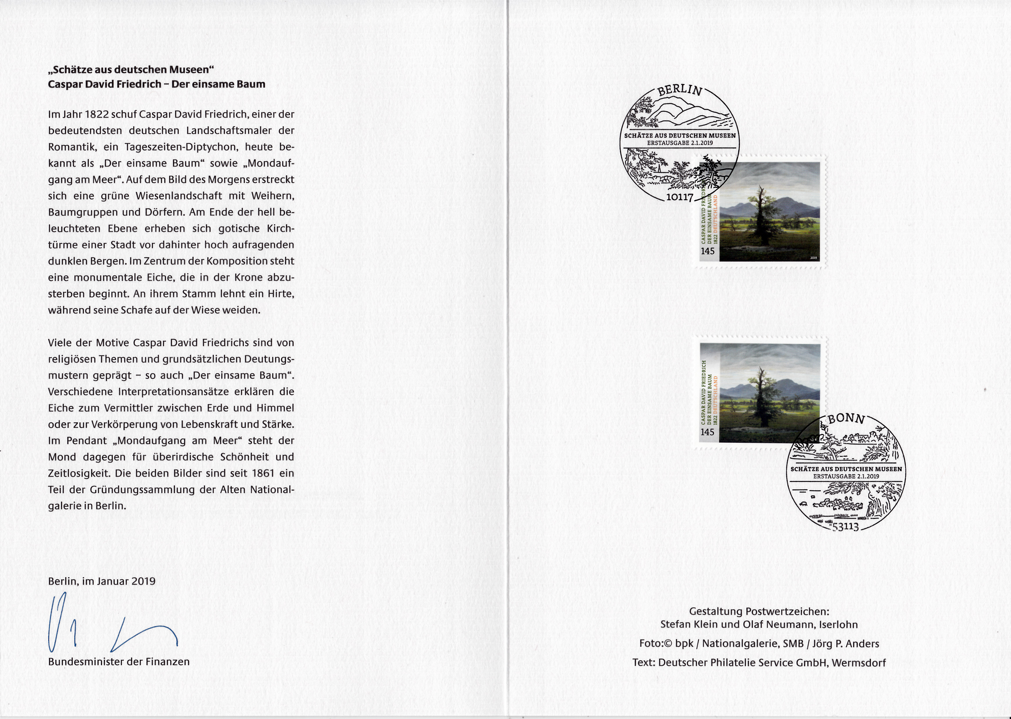Ministerkarte des Finanzministers mit zwei Marken (MiNr 3433) aus der Serie "Schätze aus deutschen Museen" mit dem Motiv "Der einsame Baum" nach einem Gemälde von Caspar Davd Friedrich und mit den beiden Ersttagsonderstempel Bonn und Berlin.