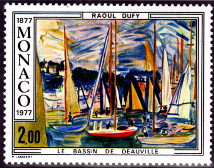 Raoul Dufy (geb. 3. Juni 1877 in Le Havre; gest. 23. März 1953 in Forcalquier) war ein französischer Maler des Fauvismus. Zu seinem 100. Geburtstag erschien in Monaco (MiNr 1269) eine Marke mit seinem Werk "Yachthafen von Deauville".