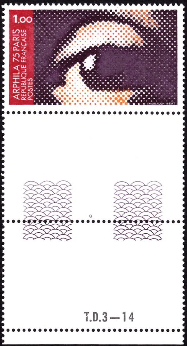 Auf einer Marke der Französischen Post (MiNr 1910) zur Internationalen Briefmarkenausstellung ARPHILA’75 in Paris wird die von Beat Knoblauch zu einem Wettbewerb zur Gestaltung der Marke eingereichte Graphik "Menschenauge" gezeigt. Hier zeige ich eine Marke vom unteren Bogenrand mit zwei Leerfelder.