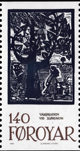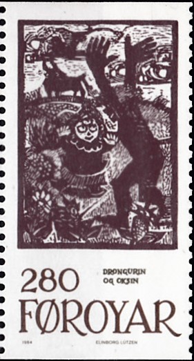 In Dänemark Färöer sind in einer Serie "Märchenillustrationen" sechs Marken mit Motive nach Linolschnitten erschienen. Auf dieser Marke (MiNr 106) wird ein Linolschnitt zum Märchen "Die Schöne mit dem Schleier" gezeigt.
