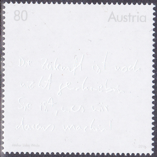 Aus Österreich kommt diese Marke zum Briefmarkengestaltungswettbewerb "Faktor Zukunft" mit einer Blinddruck-Inschrift nach einer Graphik von Anna Liska und Andreas Wesle.
