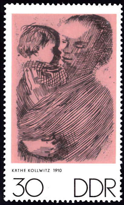 In der gleichen Serie der DDR gibt es noch eine zweite Marke mit einem Werk von Käthe Kollwitz. Der Titel ist "Mutter mit Kind auf dem Arm".