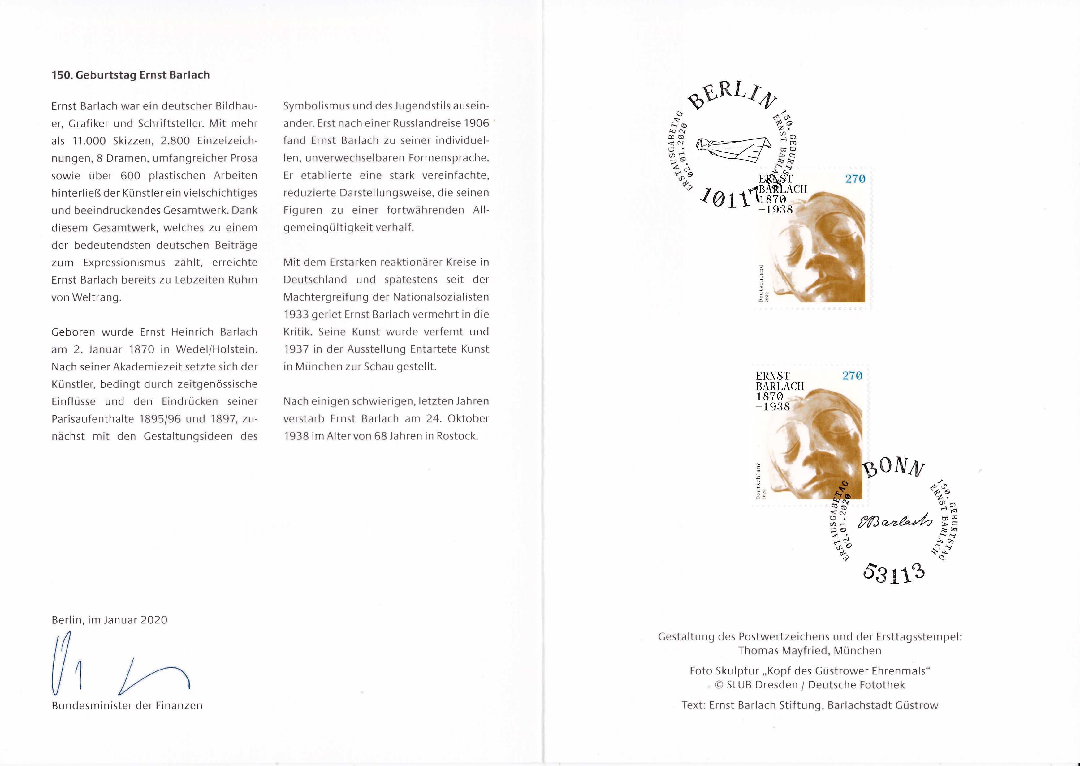 Ministerkarte des Finanzministers mit zwei Marken "150. Geburtstag von Ernst Barlach" (MiNr 3514) mit der Bronzeskulptur "Der Schwebende" mit den Gesichtszüge von Käthe Kollwitz und den beiden Ersttagsonderstempel Bonn und Berlin.