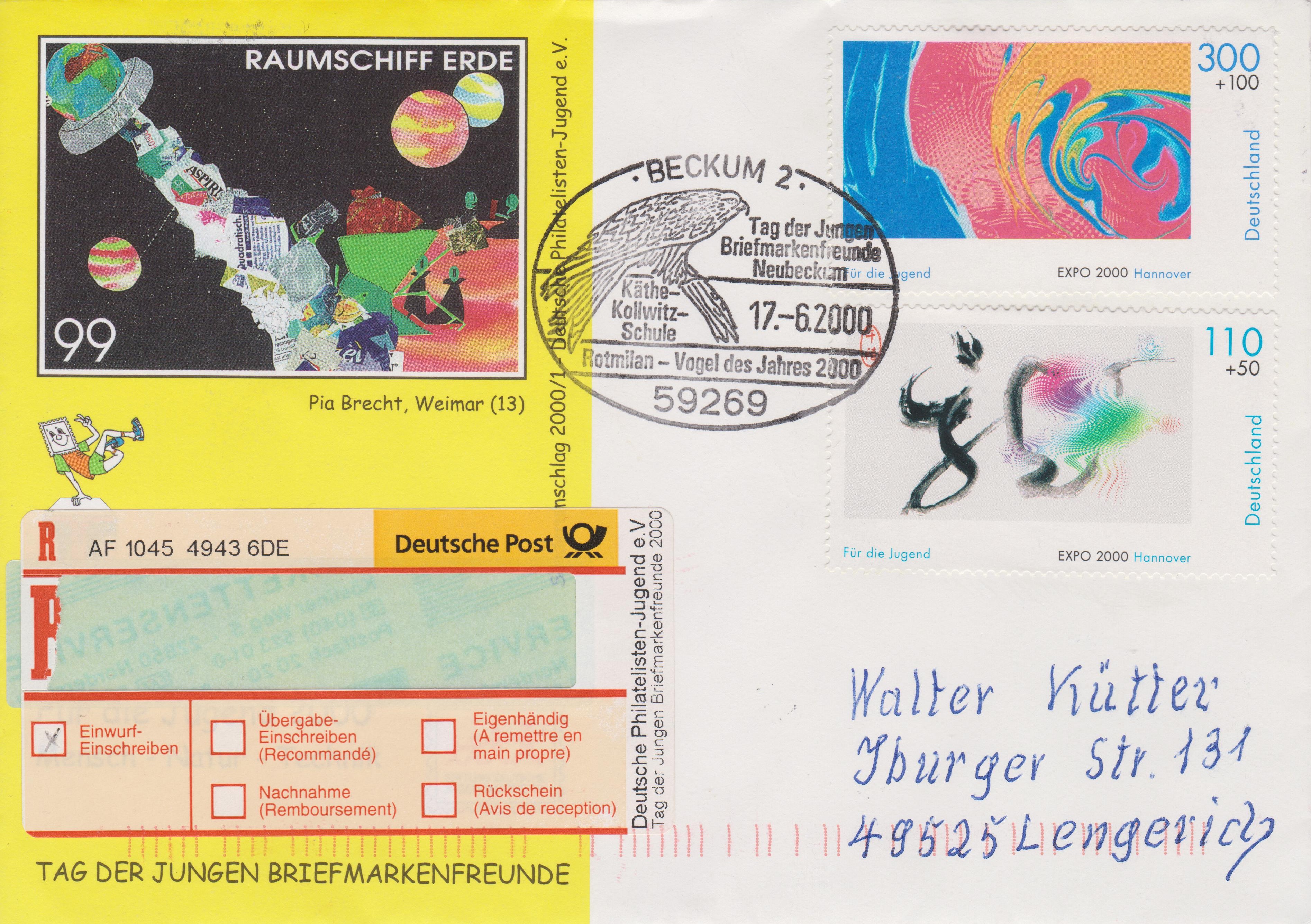 Brief per Einschreiben, Portostufe 410 Pf, frankiert mit zwei Postwertzeichen "Für die Jugend EXPO 2000 Hannover" mit Sonder-R-Zettel zum "Tag der jungen Briefmarkenfreunde 2000" sowie Sonderstempel aus BECKUM 2 "Käthe-Kollwitz-Schulel", echt gelaufen und entsprechend codiert: