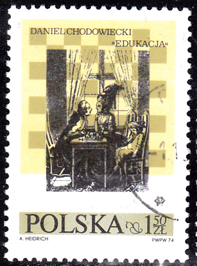 Auf einer Marke aus Polen (MiNr 2323) zum 10. Internationalen Schachfestival in Lublin wird der der Stich "Unterricht" von Daniel Chodowiecki gezeigt.