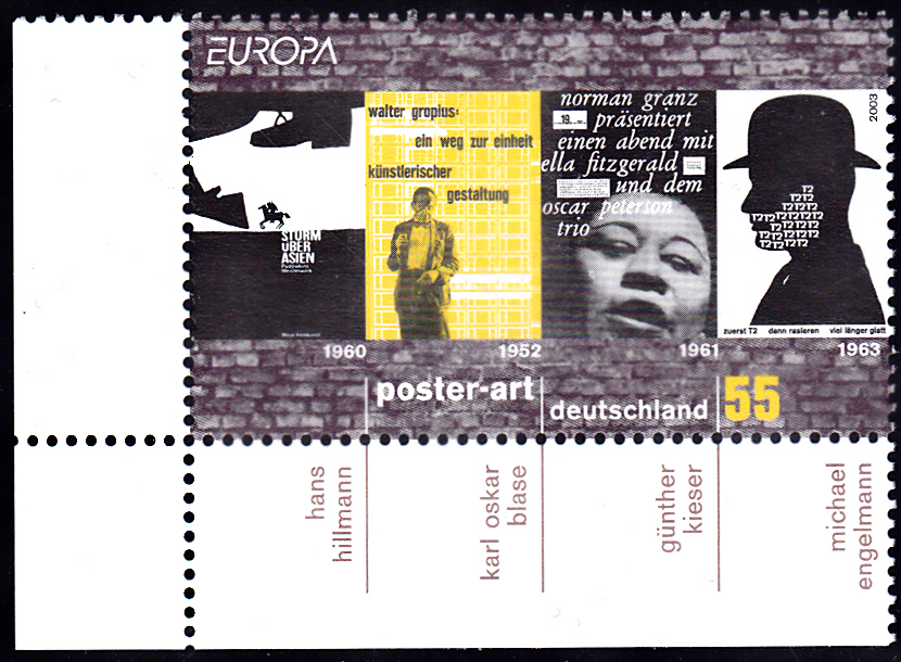Die Europamarke 2003 der Deutschen Post (MiNr 2336) zum Gemeinschaftsthema "Plakatkunst" zeigt Plakate von Karl Oskar Blase (1925-2016), Michael Engelmann, Hans Georg Hillmann (1925-2014) und Günther Kieser (1930-2023) an einer Ziegelwand. Ich zeige hier ein postfrisches Eckrandstück der Marke, auf dem Unterrand sind die Namen der jeweiligen Grafiker zu lesen.