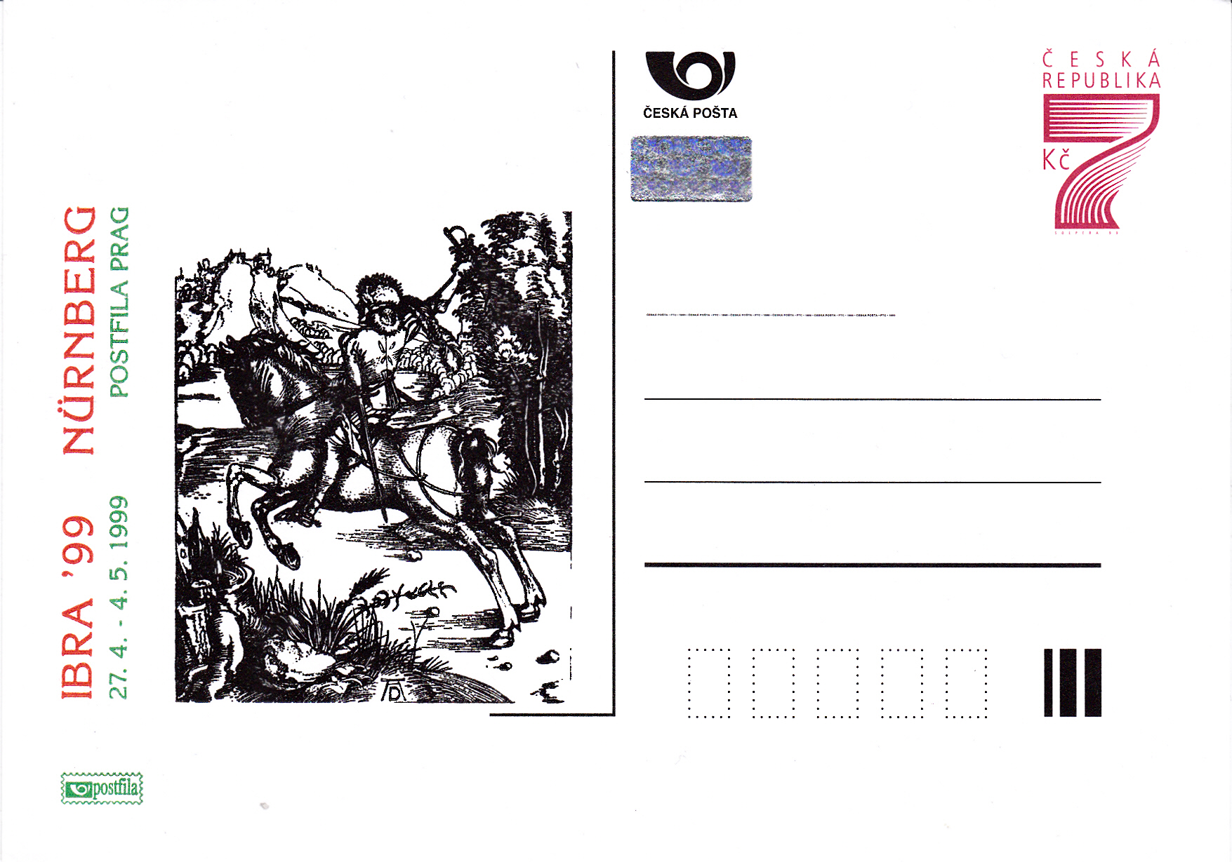Eine Ganzsachen-Postkarte aus der Tschechischen Republik zur IBRA'99 in Nürnberg zeigt als Illustration den Kupferstich "Der kleine Postreiter" von Albrecht Dürer.