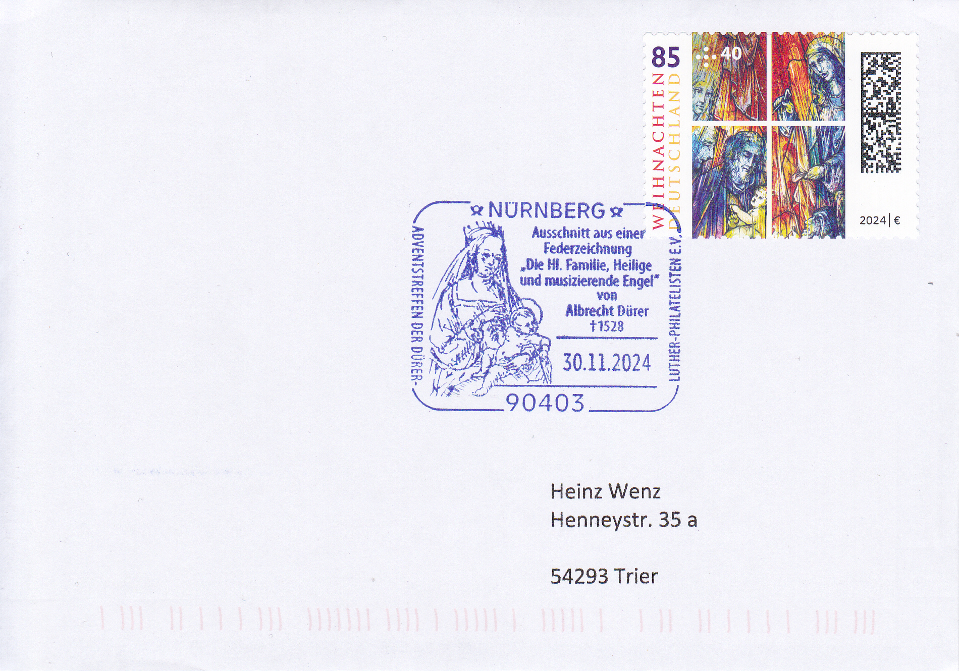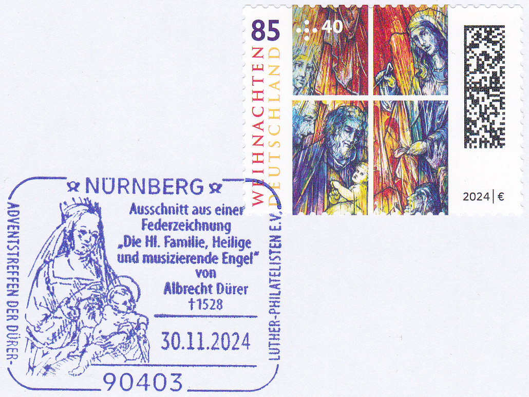 Sonderstempel aus Nürnberg vom 30.11.2024 zum Treffen der Dürer- und Luther-Philatelisten e.V. mit einem Ausschnitt aus einer Federzeichnung von Albrecht Dürer.