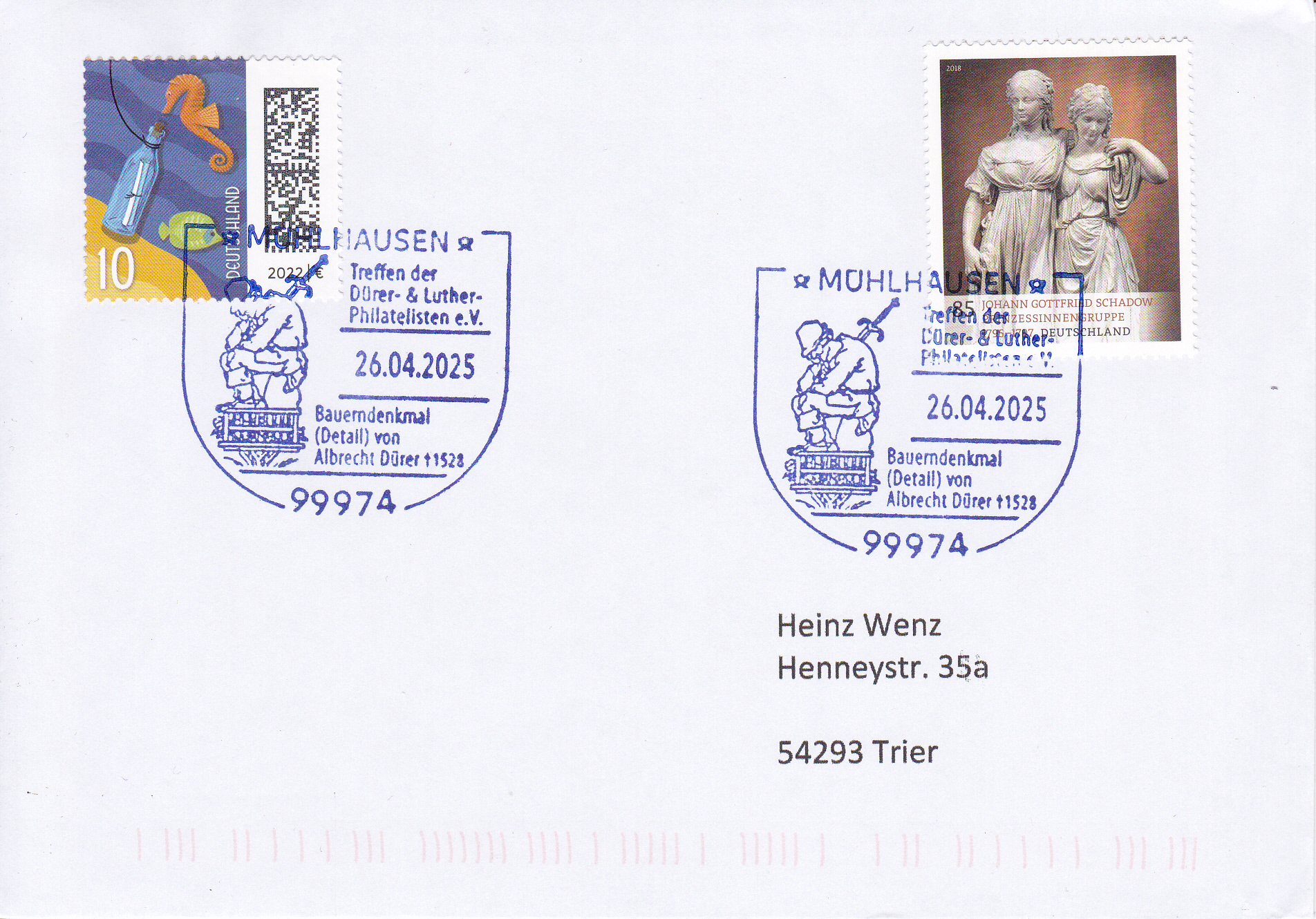 Sonderstempel aus Mühlhausen vom 26.4.2025 zum Treffen der Dürer- und Luther-Philatelisten e.V. mit einem Ausschnitt aus dem Holzschnitt "Bauerndenkmal" von Albrecht Dürer.