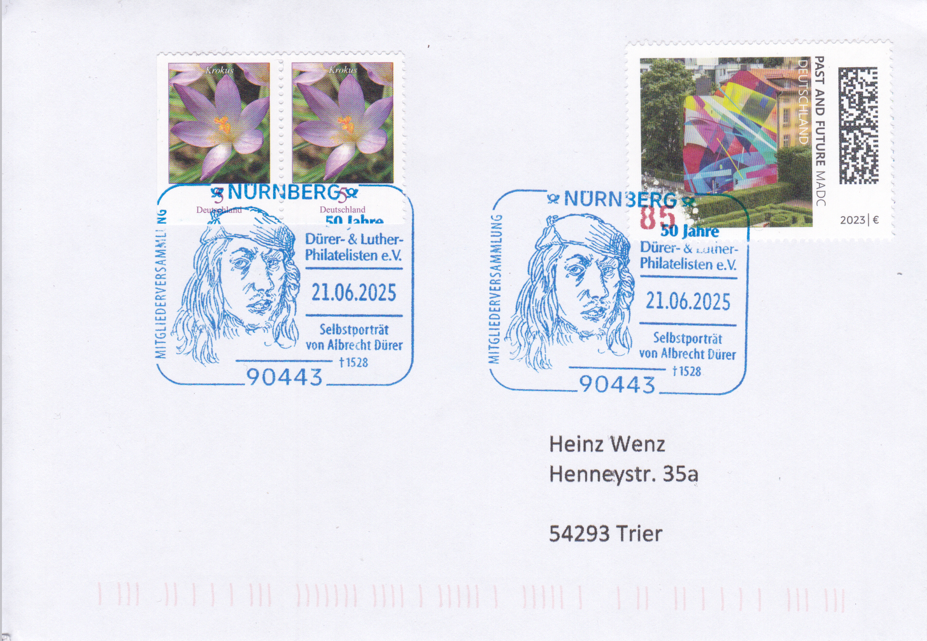 Sonderstempel aus Nürnberg vom 21.6.2025 zur Hauptversammlung der Dürer- und Luther-Philatelisten e.V. mit einem Selbstporträt von Albrecht Dürer.