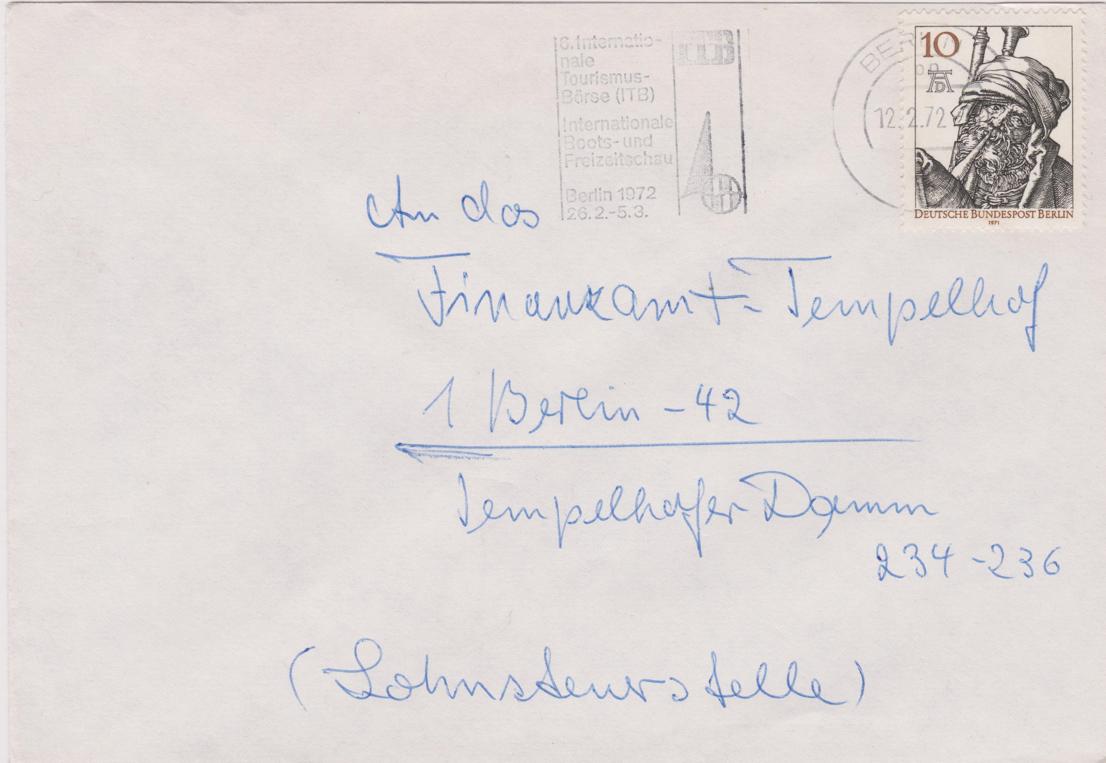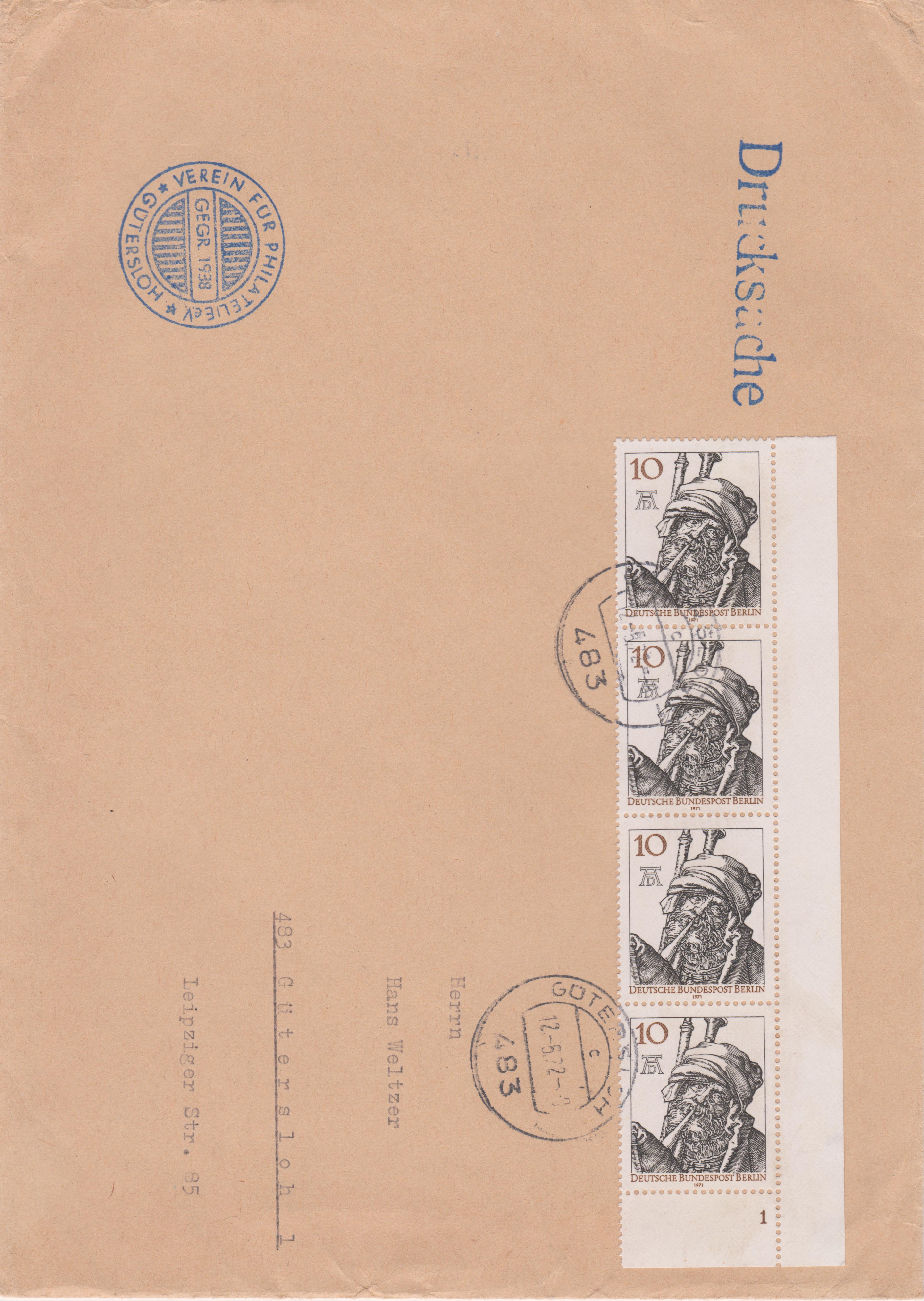 Mehrfachfrankatur der bereits gezeigten Berlin MiNr. 390 aus der rechten unteren Bogenecke mit Formnummer "1" am 12.05.1972 in der Bundesrepublik Deutschland portogerecht verwendet auf einer Drucksache mit einem Gewicht von 51 bis 100 g: