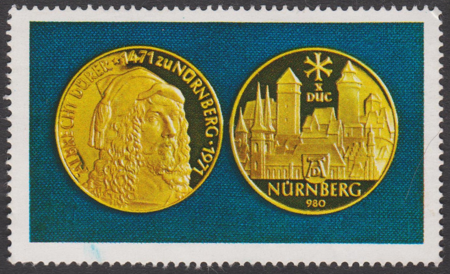 1971 (980 fein; Entwurf Werner Graul; Stempel von Eugen Wankmüller) auf den 500. Geburtstag von Albrecht Dürer. Dessen Kopf halbrechts mit Mütze (nach dem Selbstporträt von 1498 in Madrid). Rs: Stilisierte Ansicht der Burg mit Sebalduskirche in Nürnberg.