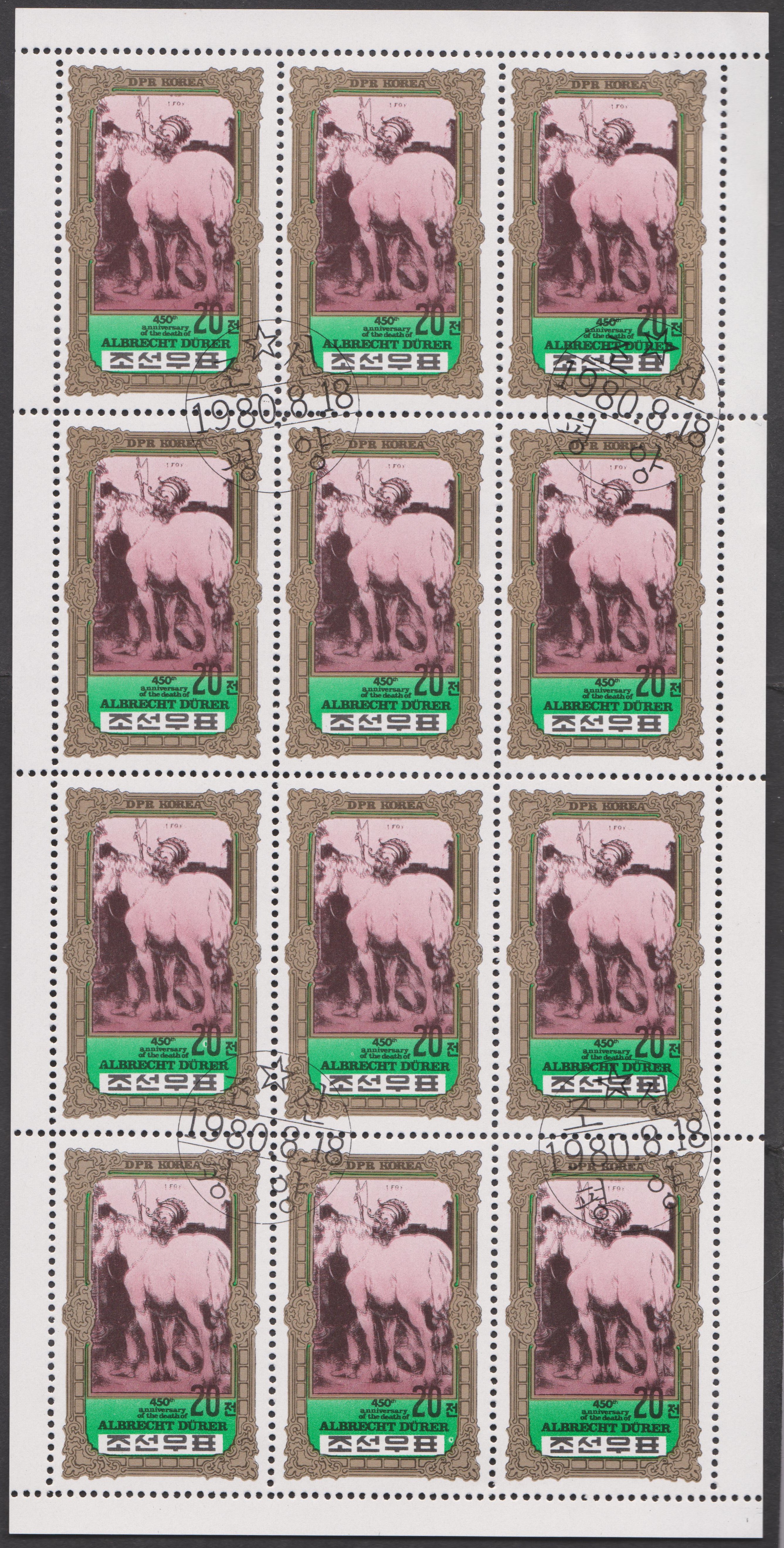 Nordkorea MiNr. 2041 erschien am 18.08.1980 zum 450. Todestag von Albrecht Dürer und zeigt "Das große Pferd", einen Kupferstich auf Bütten von 1505:
