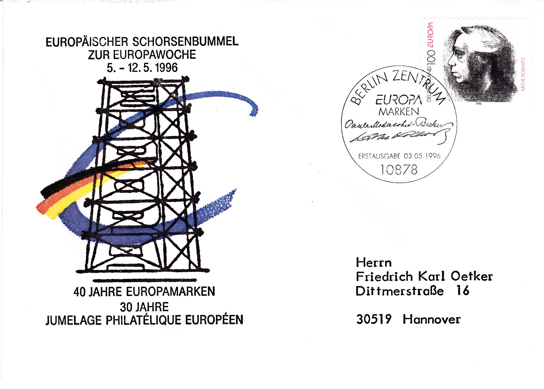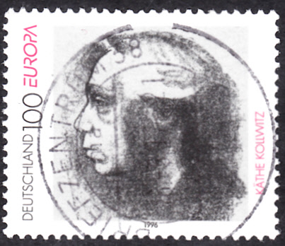 Die Europamarke 1996 der Deutschen Post zu 100Pf (MiNr 1855) zeigt ein Selbstporträt von Käthe Kollwitz.