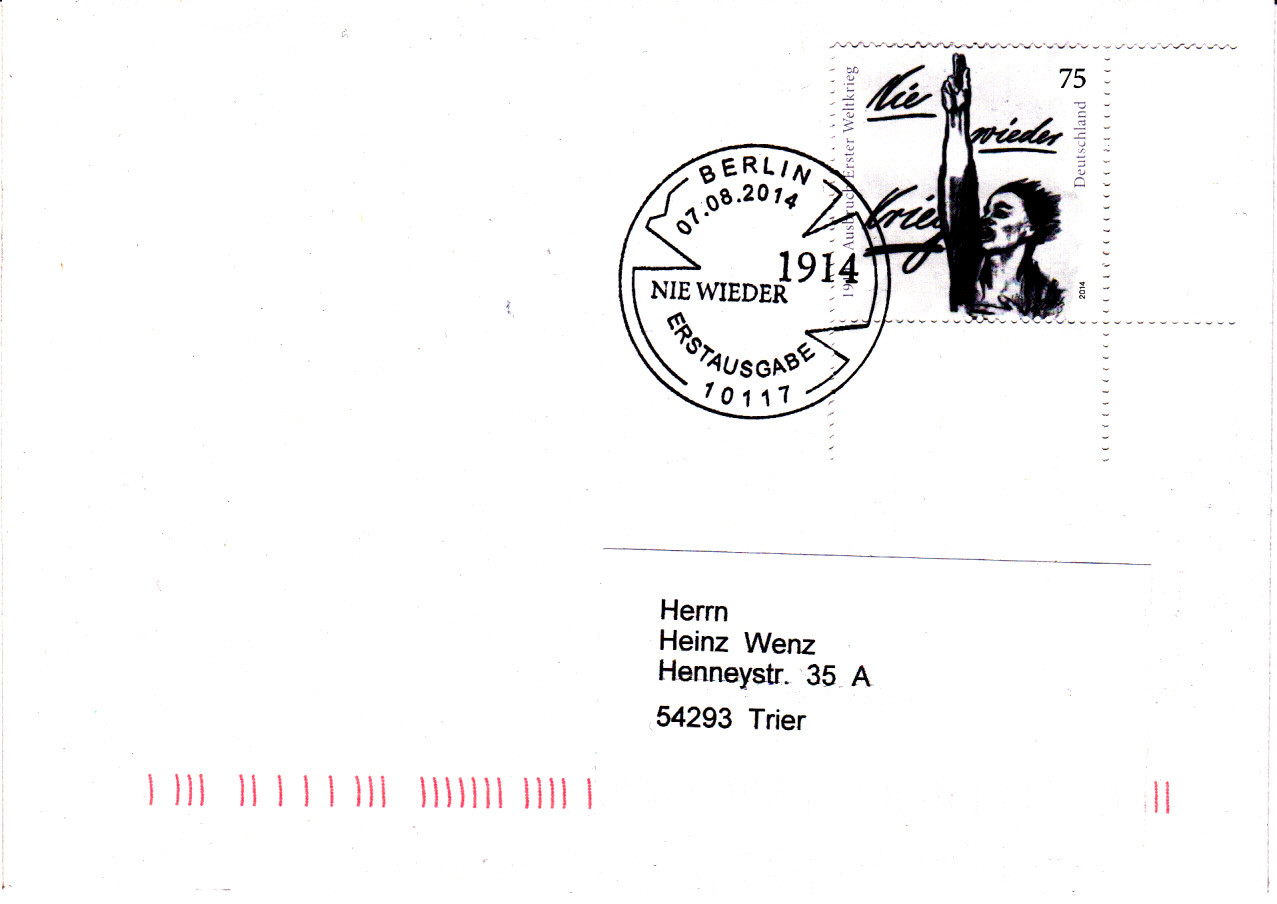 Ersttagsbrief mit dem ESST Bonn vom 7.8.2014 mit dem Text "Nie wieder" und der Jahreszahl 1914.