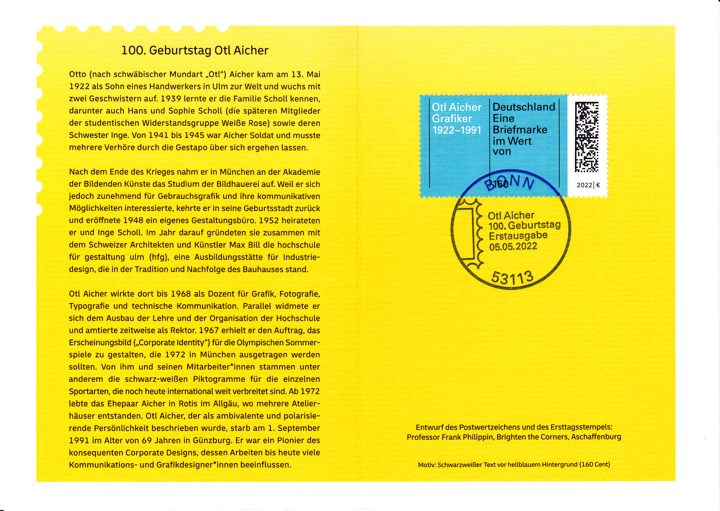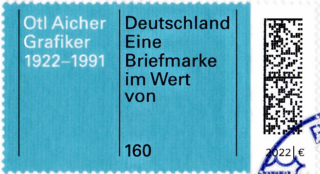 Zum 100. Geburtstag von Otto Aicher erschien bei der Deutschen Post ein Marke (MiNr 3688) mit "Weiße und schwarze Schrift auf blauem Grund".