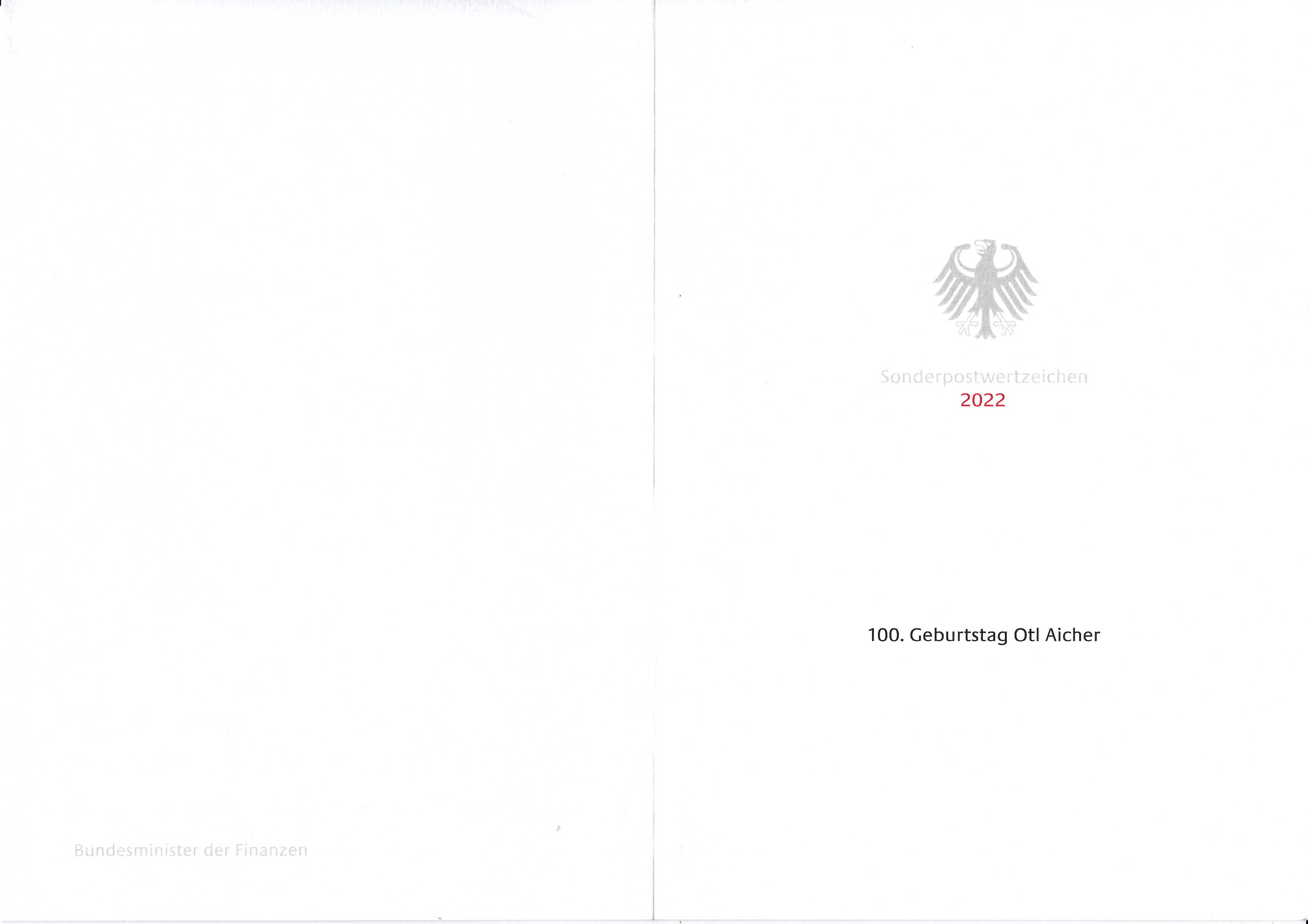 Ministerkarte des Bundesministers für Finanzen mit zwei Marken zum 100. Geburtstag von Otto "Otl" Aicher (MiNr 3688) und den beiden Ersttagsonderstempel Bonn und Berlin.