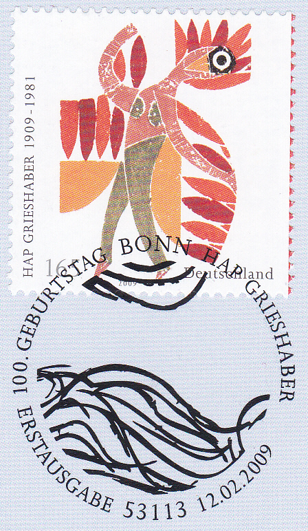 Zum 100. Geburtstag erschien bei der Deutschen Post eine Sondermarke (MiNr 2722) mit einem Farbholzschnitt "Der Feuervogel" von HAP Grieshaber.