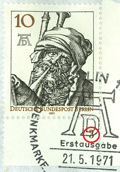 Auf der Berlin-MiNr. 390 ist ein kleiner Ausschnitt des "Dudelsackpfeifer" (Kupferstich, 1514) Dürers als Motiv umgesetzt worden.
