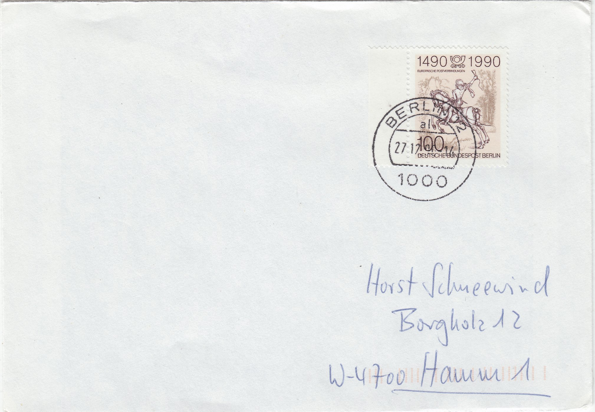Ein Detail dieses Kupferstiches diente als Motiv bei der Gemeinschaftsausgabe "500 Jahre Internationale Postverbindungen in Europa", die in der Bundesrepublik Deutschland, Berlin, DDR, Belgien und Österreich erschien. Hier ein Exemplar Berlin MiNr. 860 vom linken Bogenrand, am 27.12.1990 als Einzelfrankatur auf einem Standardbrief (100 Pf) von Berlin nach Hamm: