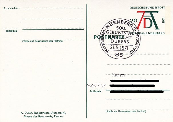 Zu seinem 500. Geburtstag gab es das Dürer-Jahr und die Deutsche Post veröffentliche diese Ganzsache. Auf der Vorderseite sieht man die eingedruckte Marke und es gab einen Sonderstepel.