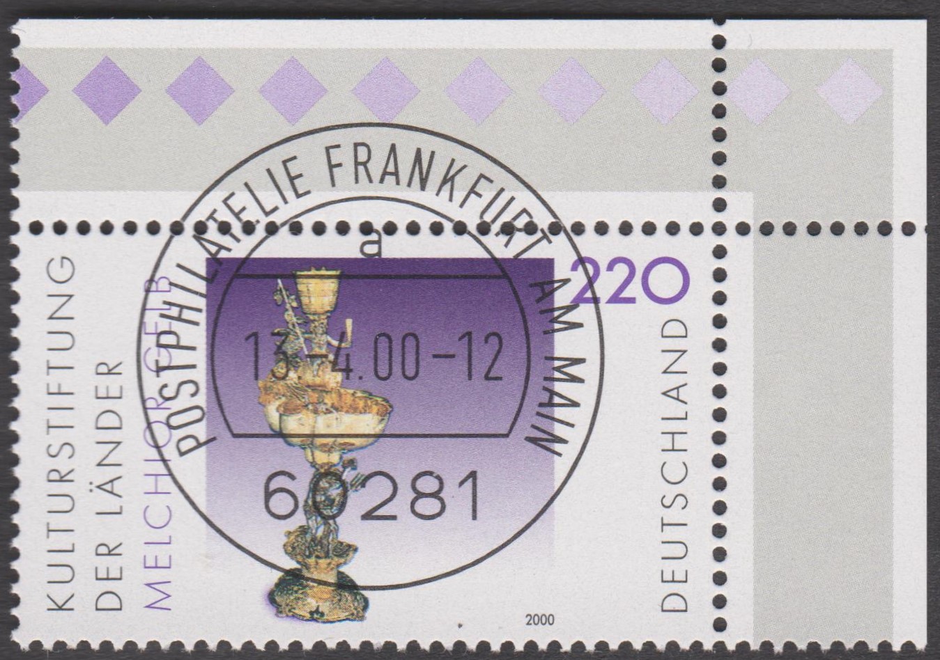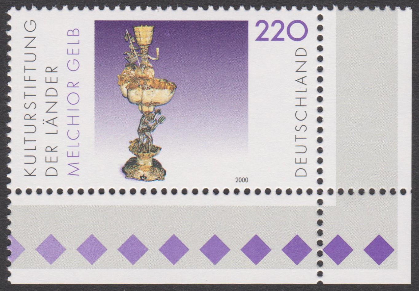 Bund MiNr. 2108 zeigt die Skulptur "Silberner Tafekbrunnen" von Melchior Gelb (1581-1654), hier aus der linken oberen (= Feld 1) sowie rechten unteren Bogenecke des Zehnerbogens (= Feld 10) mit ESST BERLIN: