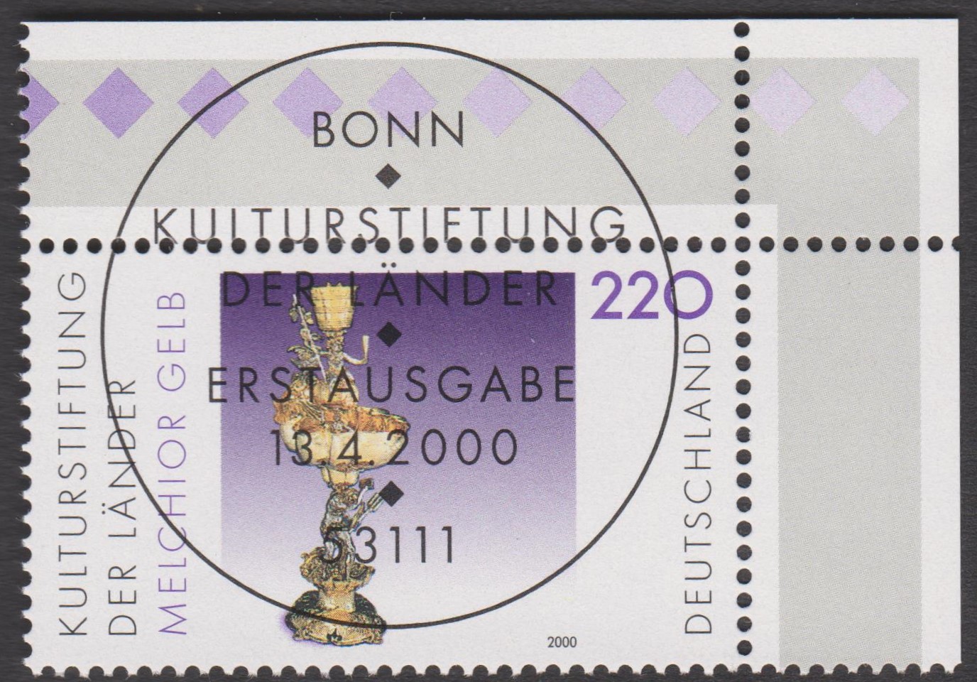 Bund MiNr. 2108 zeigt die Skulptur "Silberner Tafekbrunnen" von Melchior Gelb (1581-1654), hier aus der linken oberen (= Feld 1) sowie rechten unteren Bogenecke des Zehnerbogens (= Feld 10) mit ESST BERLIN: