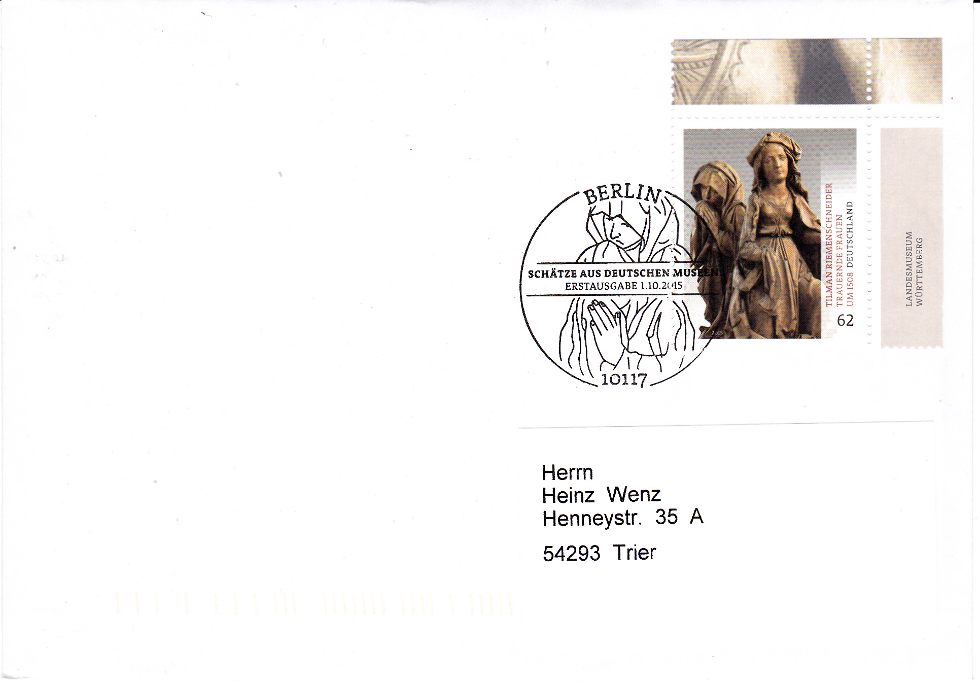 Am 1.10.2015 erschien bei der Deutschen Post eine Marke "Schätze aus deutschen Museen" (MiNr 3180) mit der Holzskulptur "Trauernde Frauen" von Tilman Riemenschneider. Die Skulptur befindet sich heute im Landesmuseum Württemberg in Stuttgart.