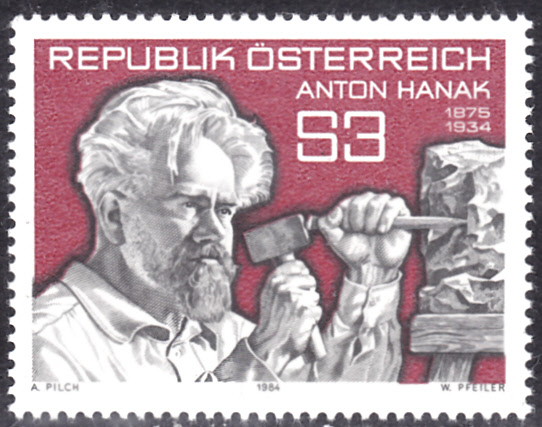 Zum 50. Todestag von Anton Hanak ist in Österreich diese Marke (MiNr 1764) erschienen, die ihn beim Bearbeiten einer Skulptur zeigt.