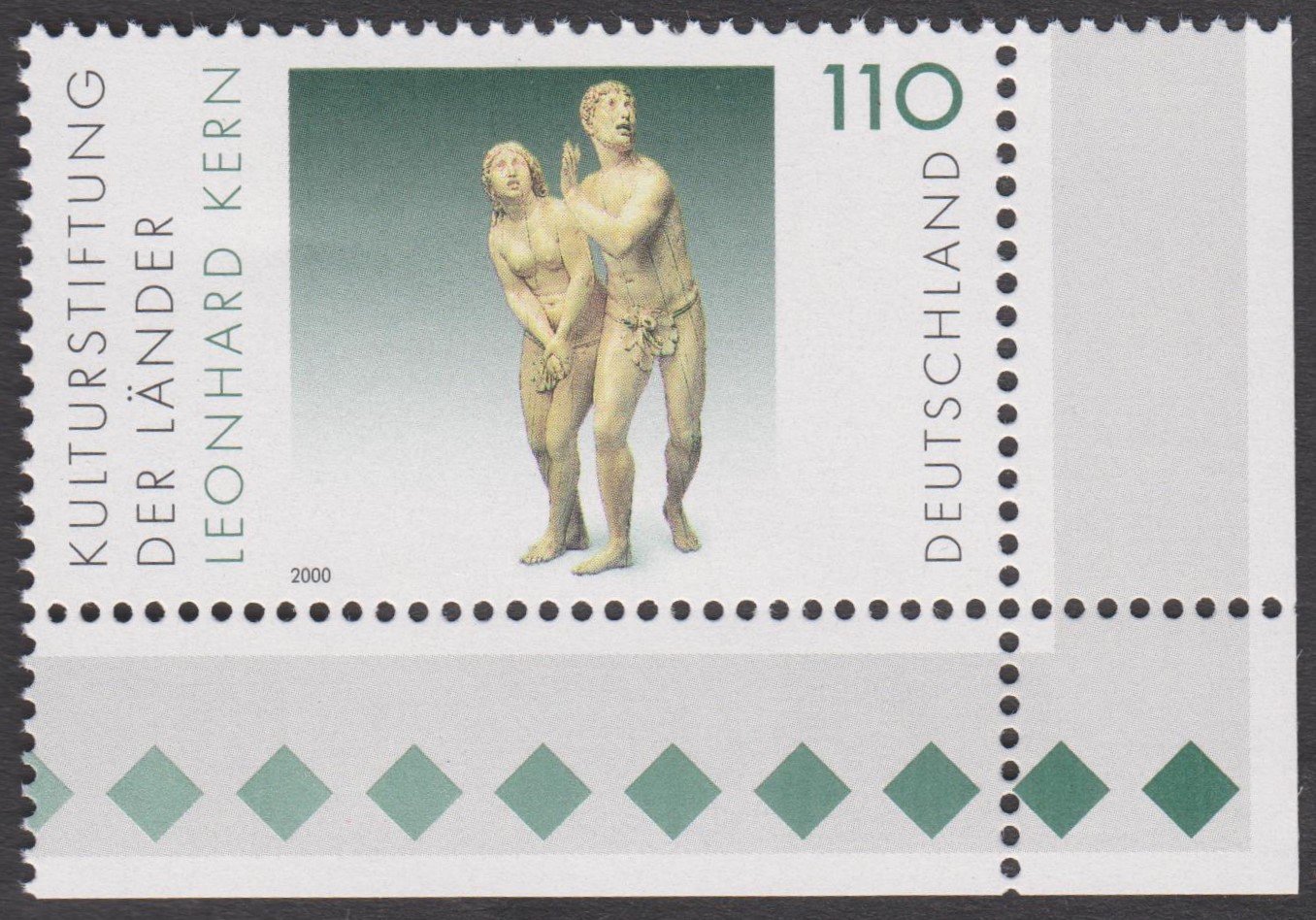 Bund MiNr. 2107 zeigt die Elfenbeinskulptur "Die Vertreibung aus dem Paradies", hier Eckrandstücke aus der linken oberen sowie rechten unteren Bogenecke des Zehnerbogend postfrisch: