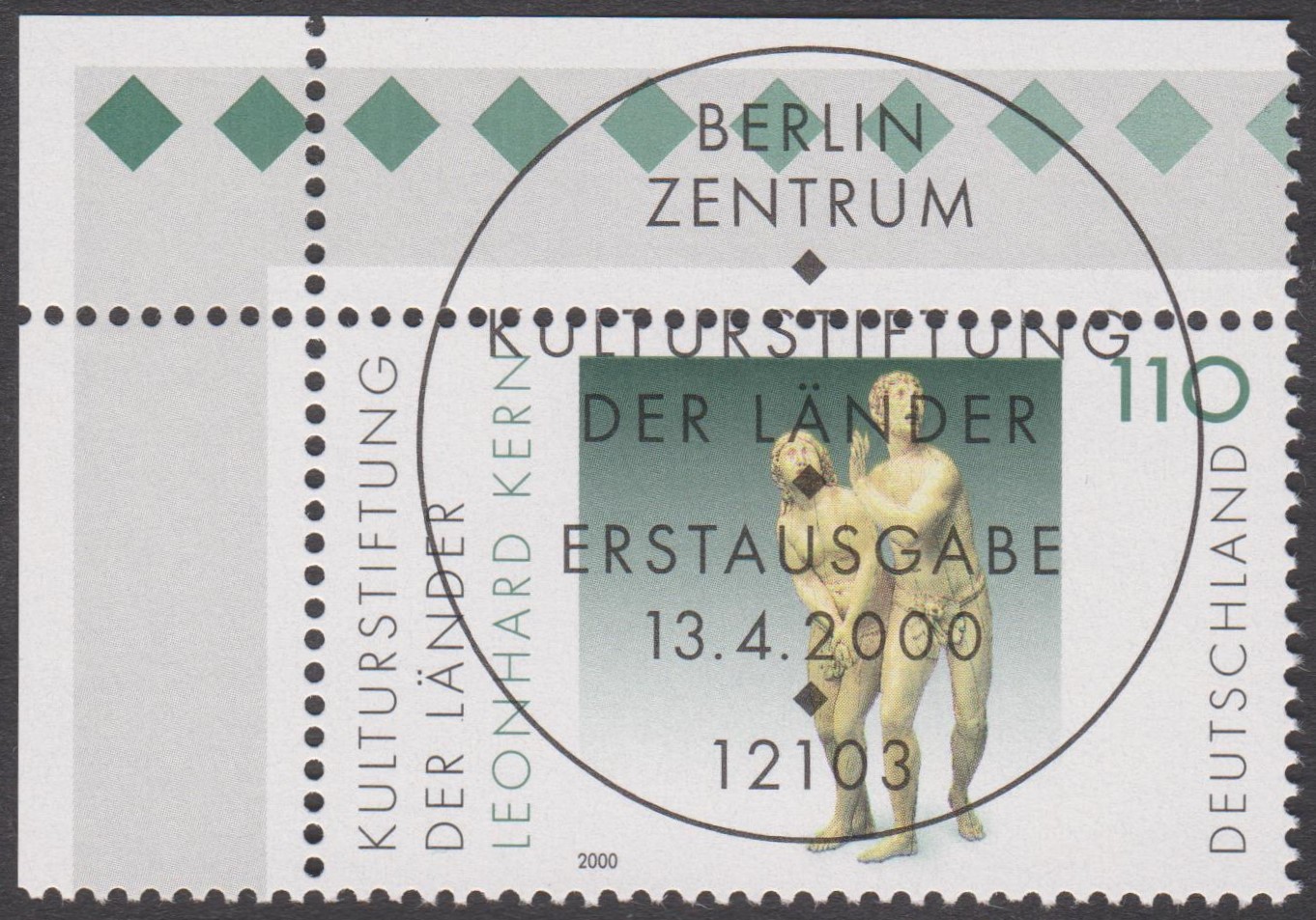 Bund MiNr. 2107 zeigt die Elfenbeinskulptur "Die Vertreibung aus dem Paradies", hier ein Eckrandstück aus der rechten oberen Bogenecke des Zehnerbogend (= Feld 2) mit ESST BONN: