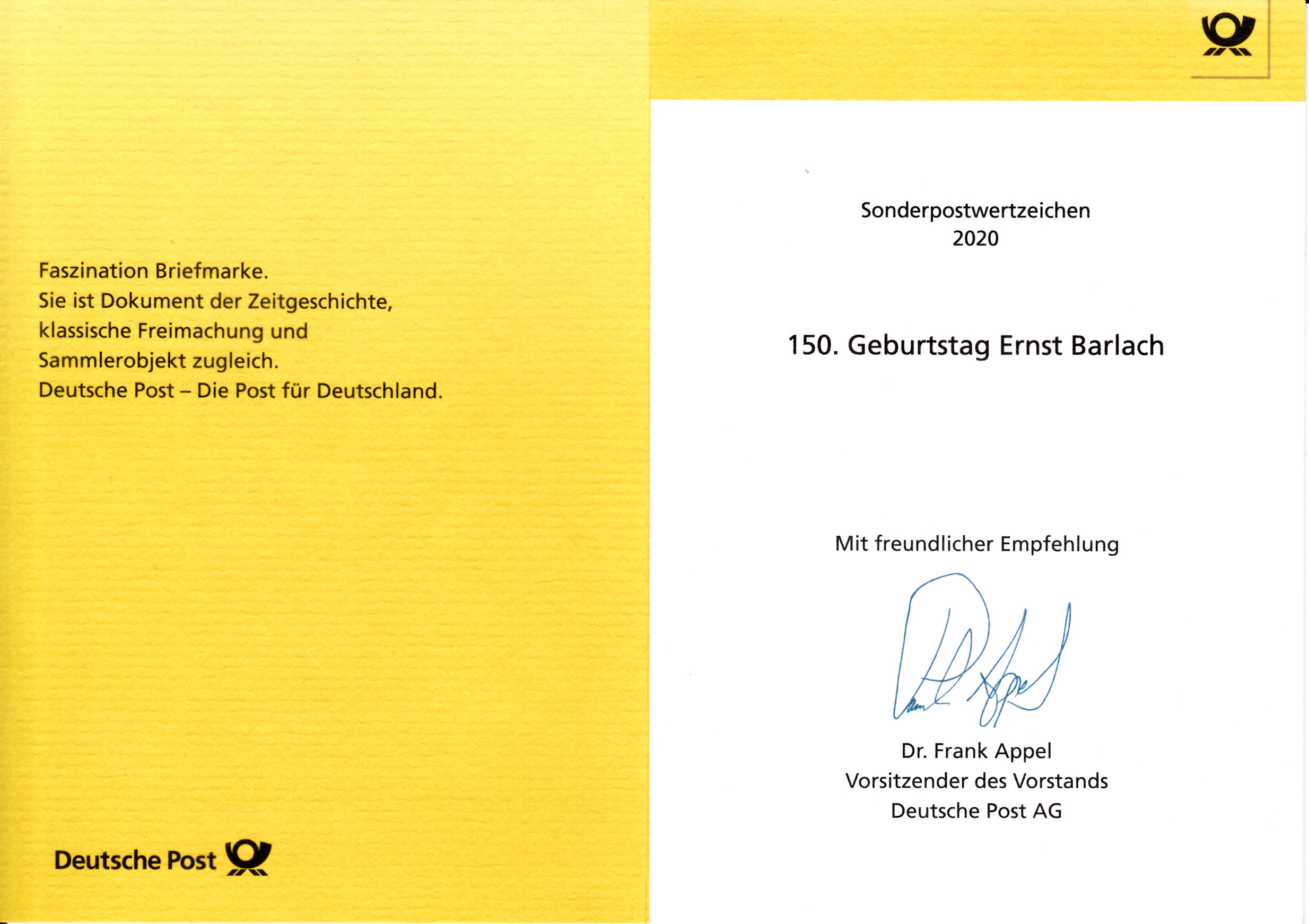Klappkarte des Vorstandsvorsitzenden der Deutschen Post AG mit der Marke "150. Geburtstag von Ernst Barlach" (MiNr 3514) und mit dem Ersttagsonderstempel Bonn.