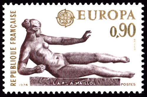 Die Europamarke 1874 zu 0,90 Franc aus Frankreich zeigt eine Bronzeskulptur "L´Air" von Aristide Maillol.