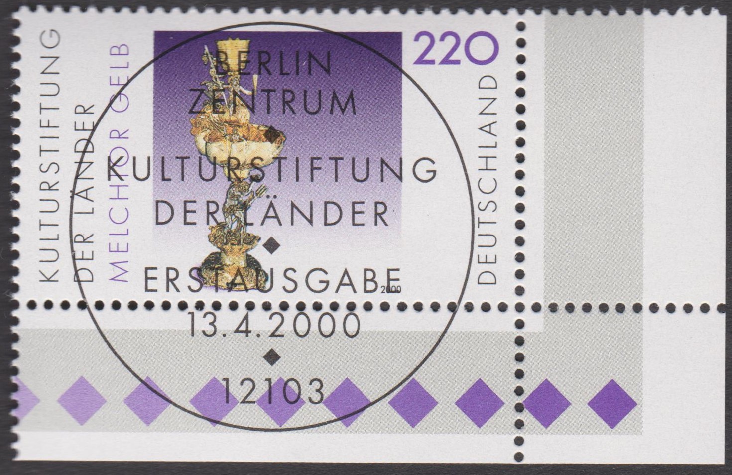 Bund MiNr. 2108 zeigt die Skulptur "Silberner Tafekbrunnen" von Melchior Gelb (1581-1654), hier aus der linken oberen (= Feld 1) sowie rechten unteren Bogenecke des Zehnerbogens (= Feld 10) mit ESST BERLIN: