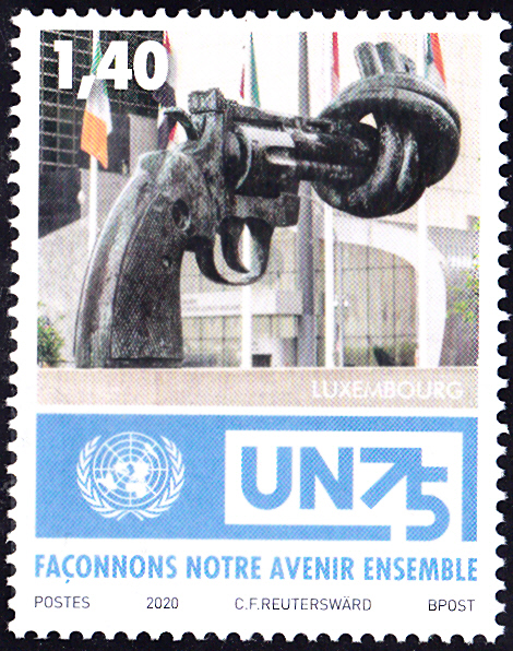 Auf dieser Marke aus Luxemburg (MiNr 2237), zum Thema "75 Jahre Vereinte Nationen" zeigt die Skulptur „Non Violence“ von Carl Fredrik Reuterswärd.