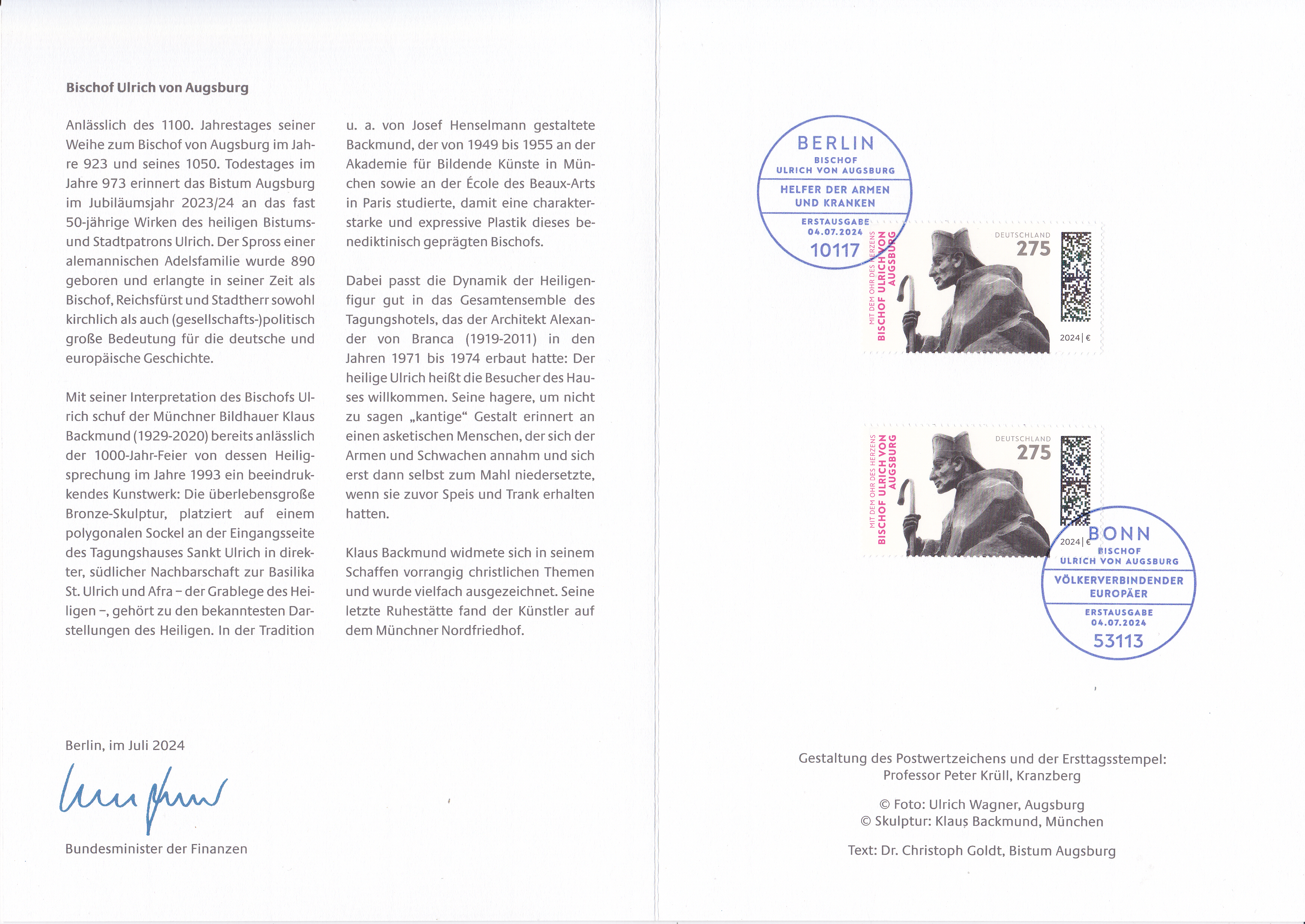 Ministerkarte des Bundesministers für Finanzen mit zwei Marken "Bischof Ulrich von Augsburg" (MiNr 3841) und den beiden Ersttagsonderstempel Bonn und Berlin.