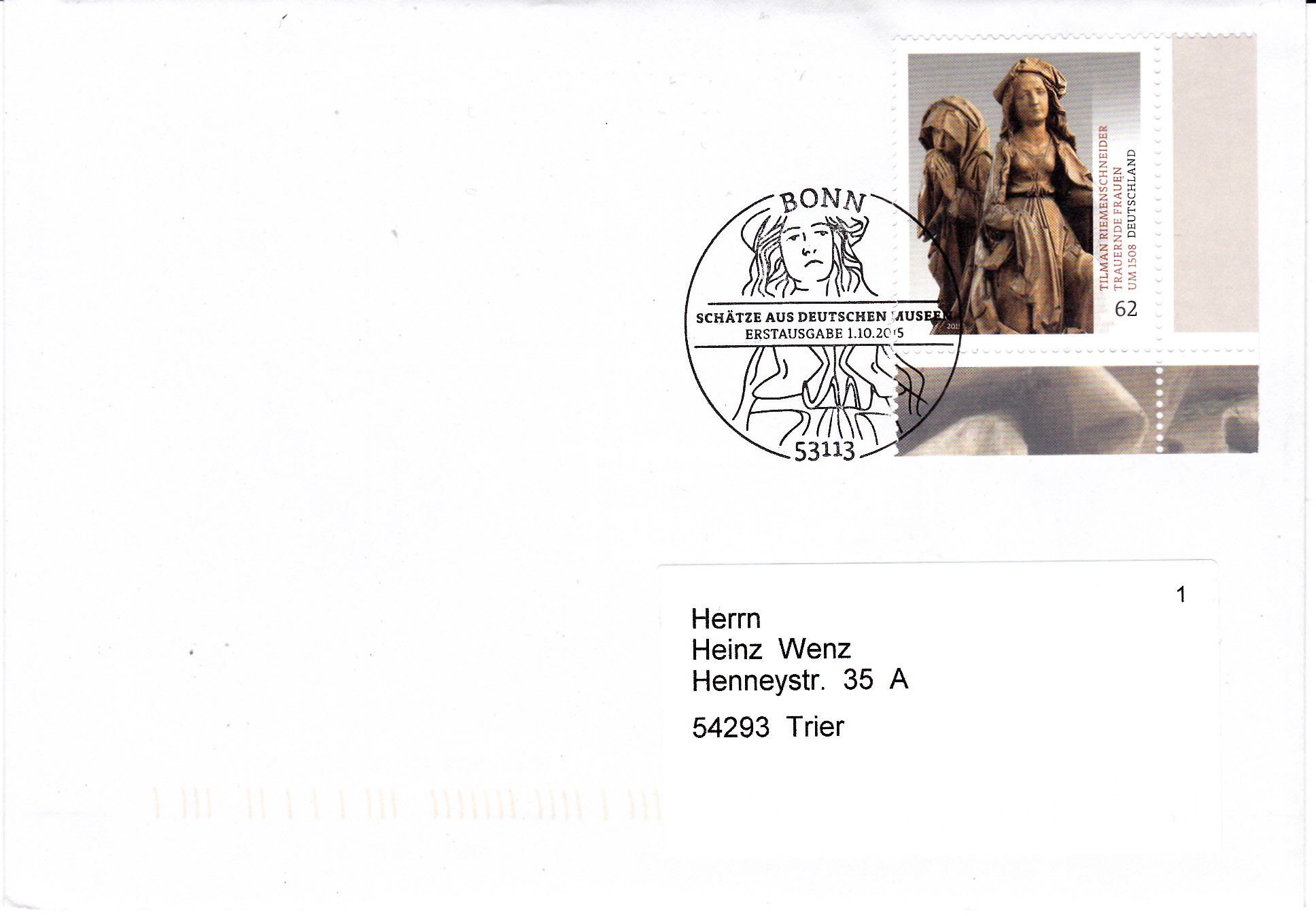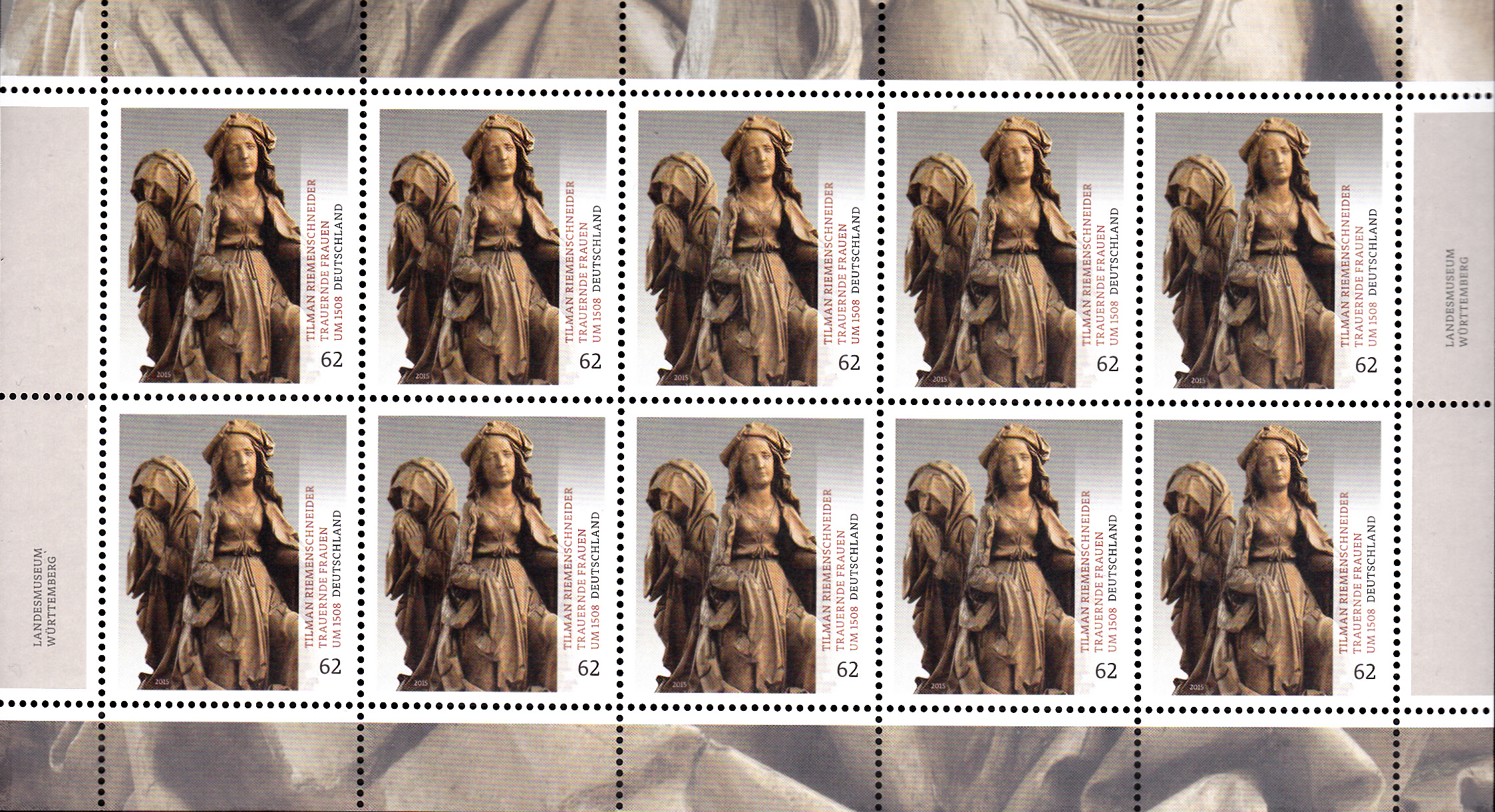 Am 1.10.2015 erschien bei der Deutschen Post eine Marke "Schätze aus deutschen Museen" (MiNr 3180) mit der Holzskulptur "Trauernde Frauen" von Tilman Riemenschneider. Die Skulptur befindet sich heute im Landesmuseum Württemberg in Stuttgart.