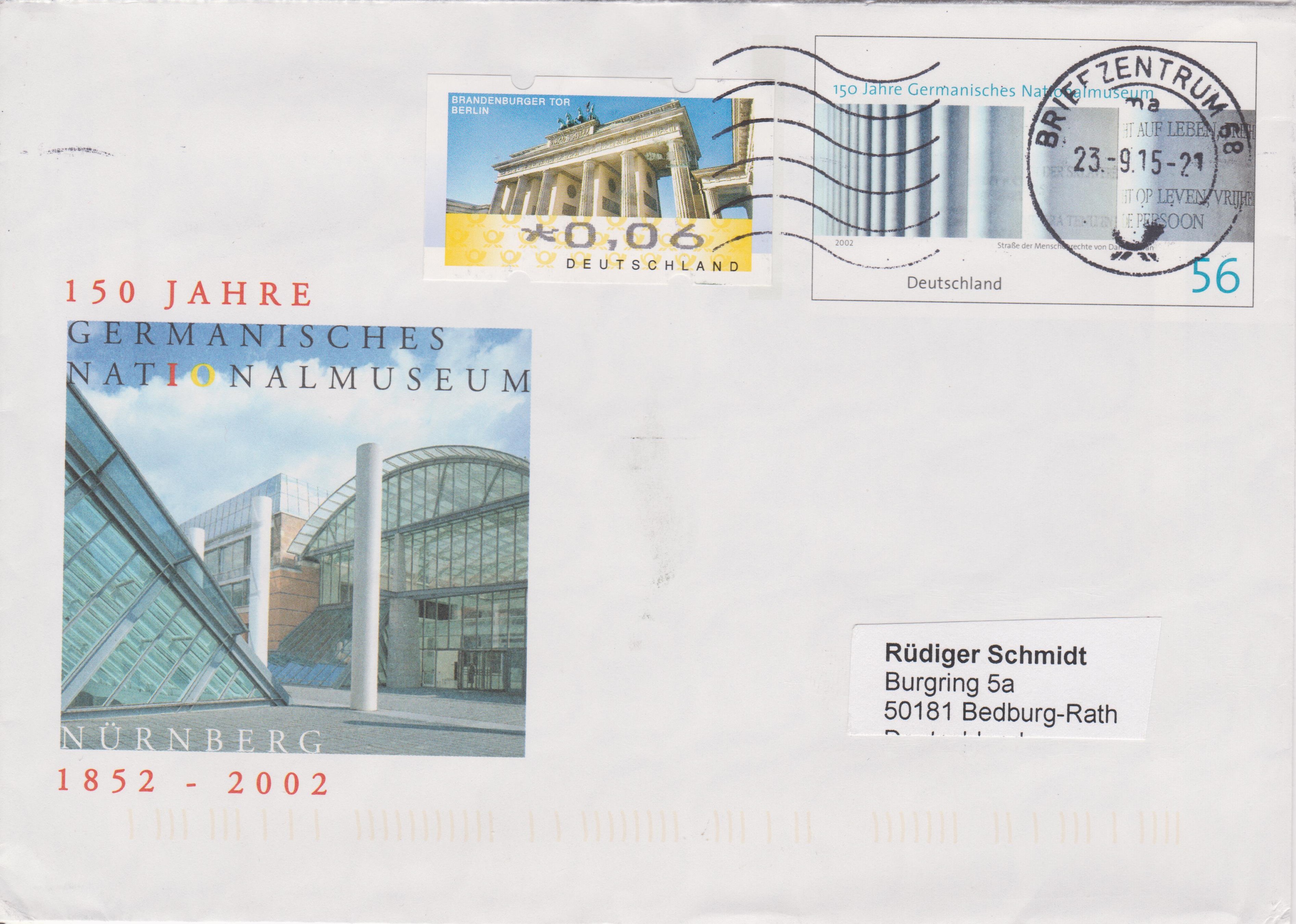 Am 04.07.2002 erschien in einer Auflage von 277.000 Exemplaren dieser Gedenkumschlag "150 Jahre Germanisches Nationalmuseum", hier am 23.09.2015 mit einer Automatenmarke der Wertstufe zu 0,06 € als Zusatzfrankatur verwendet ab BIEFZENTRUM 68: