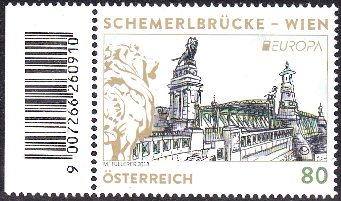 Die Europamarke 2018 aus Österreich (MiNr 3393) zeigt uns diese Brücke mit den beiden Löwen auf den Mauerpfeilern und am linken Bildrand einen der beiden Löwen. Hier eine Marke vom linken Bogenrand mit EAN-Code.