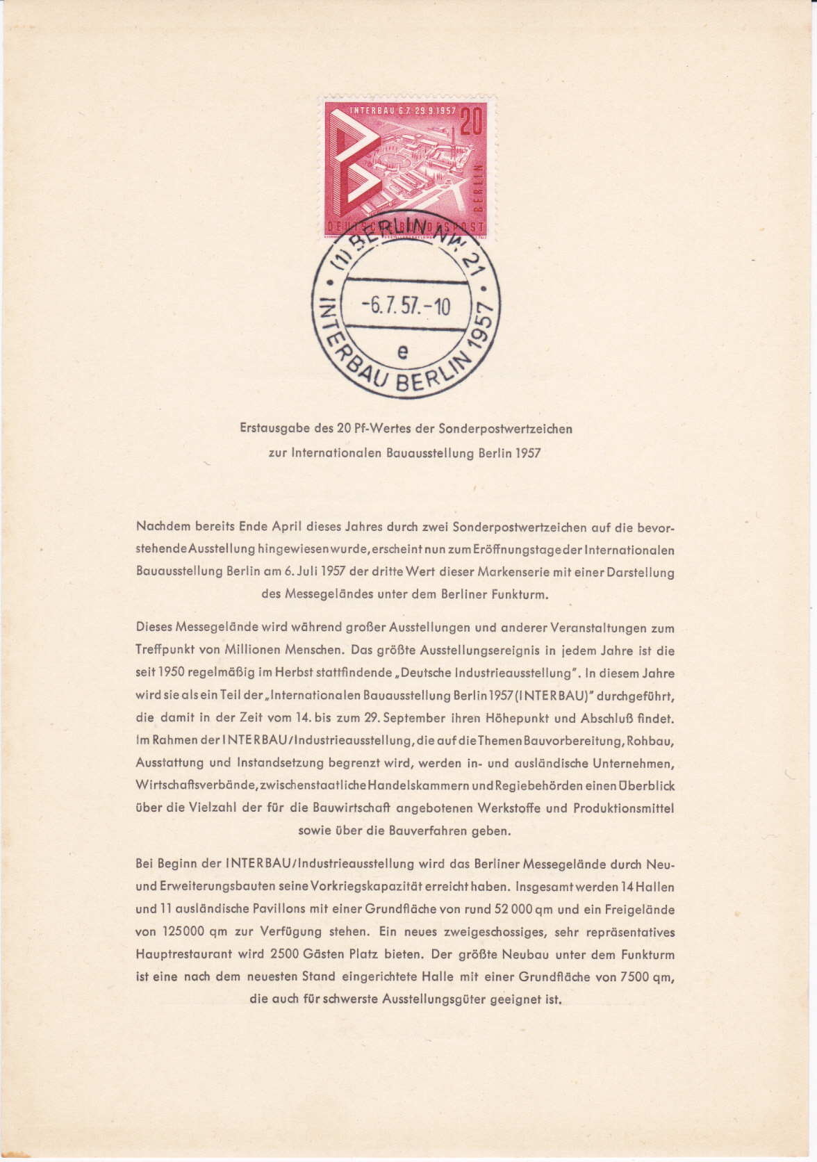 Am 27. April 1957 ist zur "Interbau" in Berlin eine Marke zu 7 Pfennig (MiNr 160) erschienen. Sie zeigt ein Modell des Hansaviertels.
