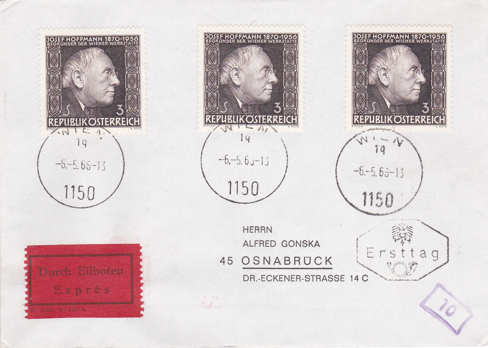 Zum 10. Todestag von Josef Hoffmann erschien in Österreich eine Marke mit seinem Porträt (MiNr 1205).