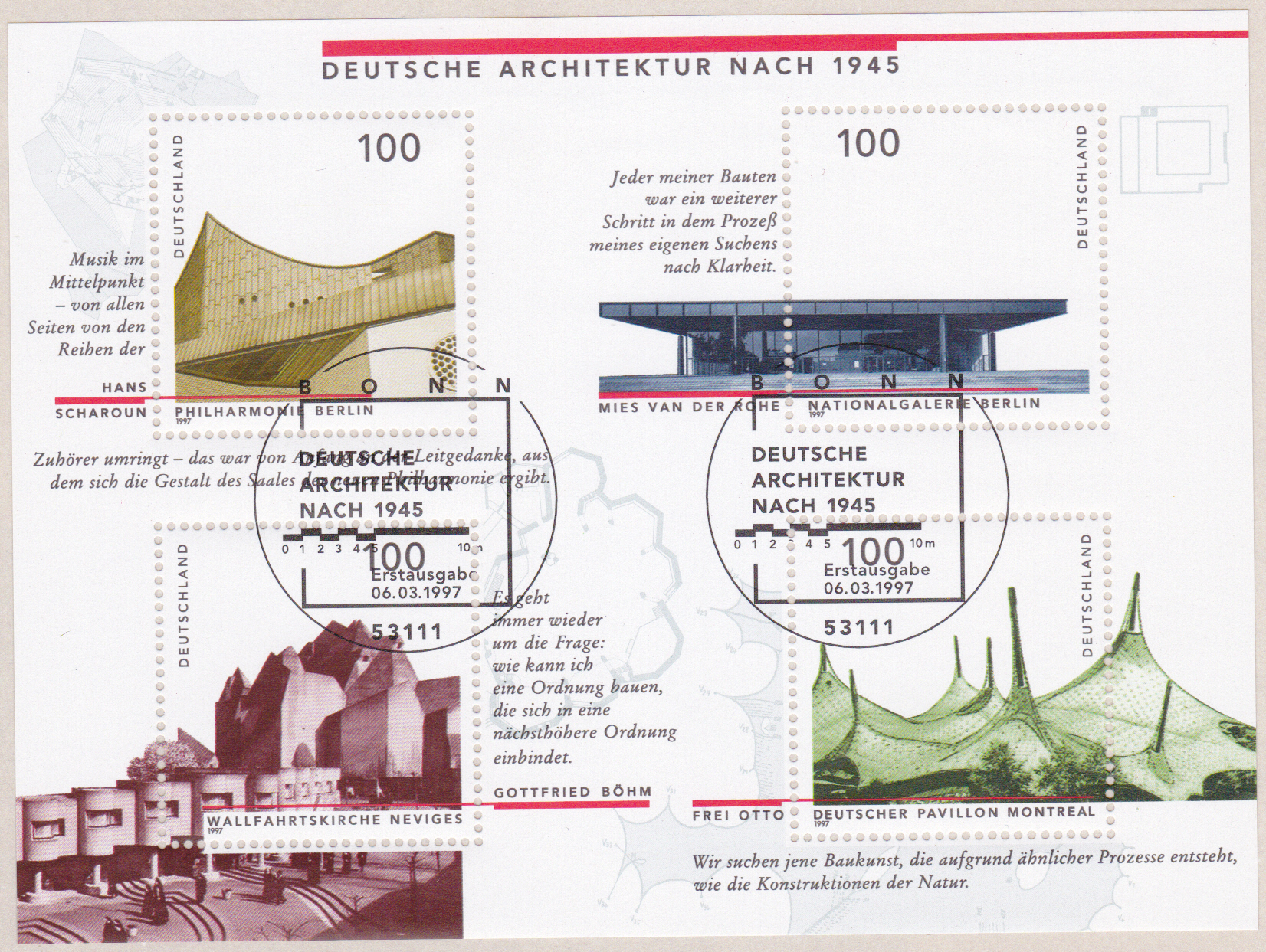 In der Blockausgabe "Deutsche Architektur" erschien eine Marke (MiNr 1906) mit der Berliner Philharmonie von Hans Scharoun.